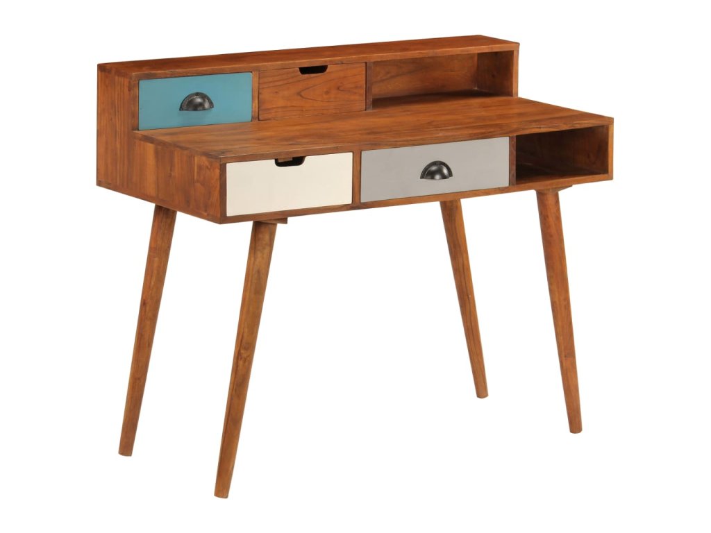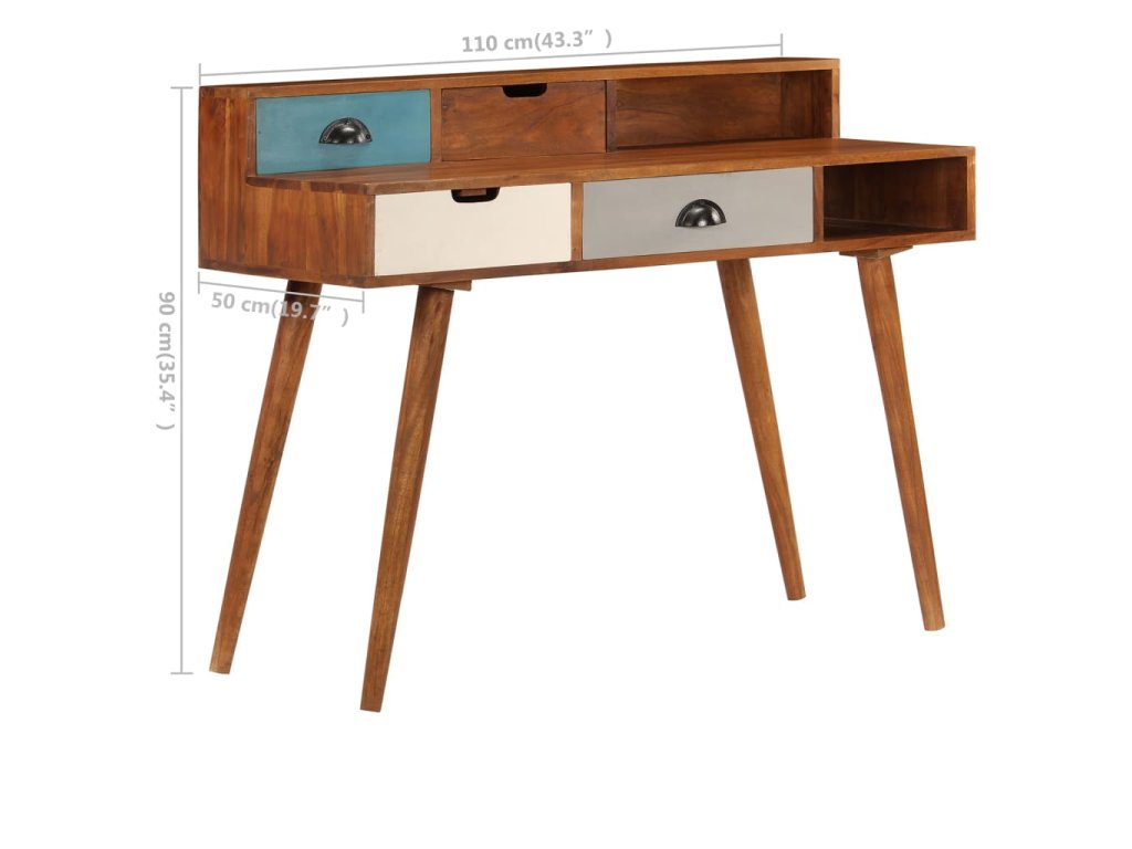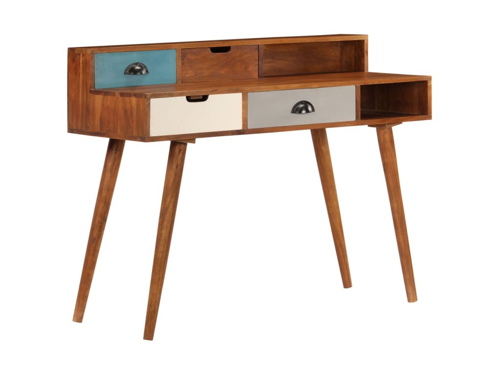 Tento písací stôl je vyrobený z masívneho akáciového dreva s náterom v tmavej medovej farbe, vďaka ktorému je veľmi stabilný a odolný. Každý krok výrobného procesu sa vykonáva s najvyššou starostlivosťou, či už ide o leštenie, maľovanie alebo lakovanie. Vďaka remeselnému spracovaniu a krásnej drevenej štruktúre je každý kus nábytku jedinečný a mierne odlišný od ďalšieho kusu. Má 4 zásuvky a 2 úložné priehradky, kam môžete jednoducho uložiť svoje šanóny, papiere, dokumenty a iné osobné predmety. Montáž je jednoduchá.
