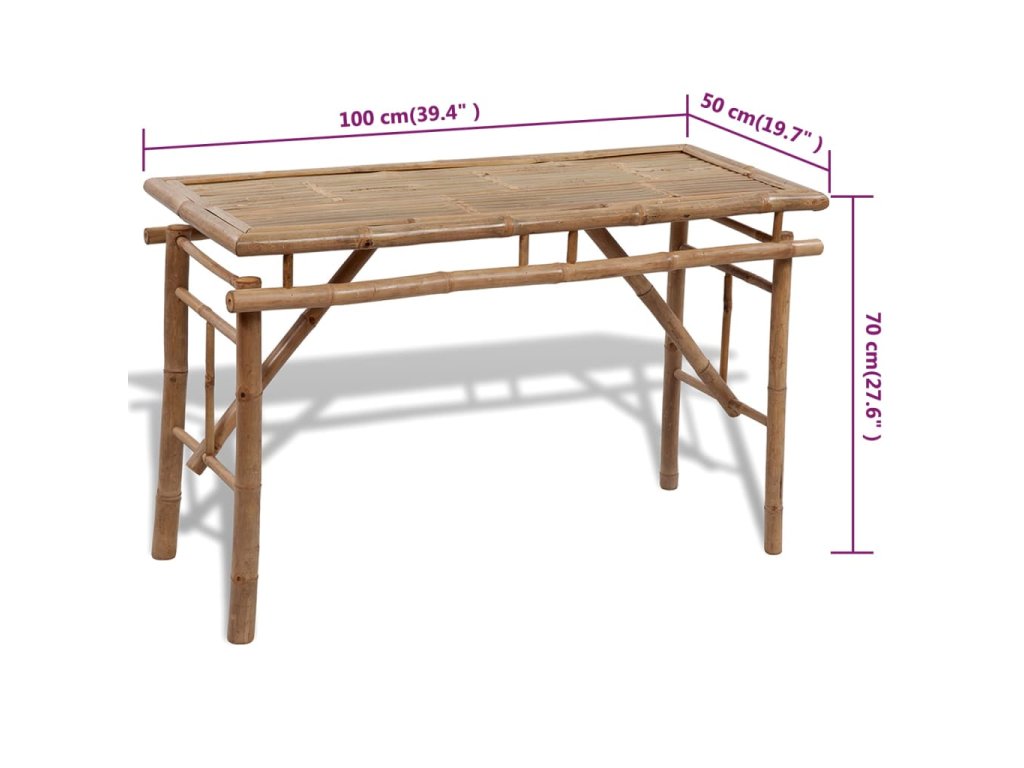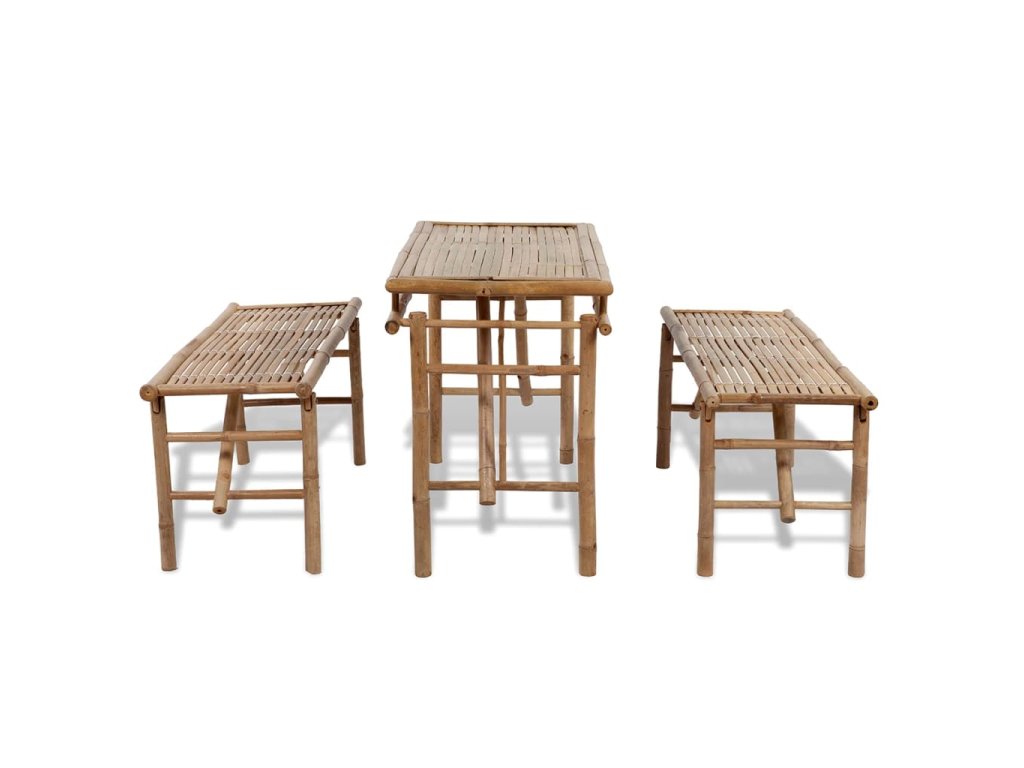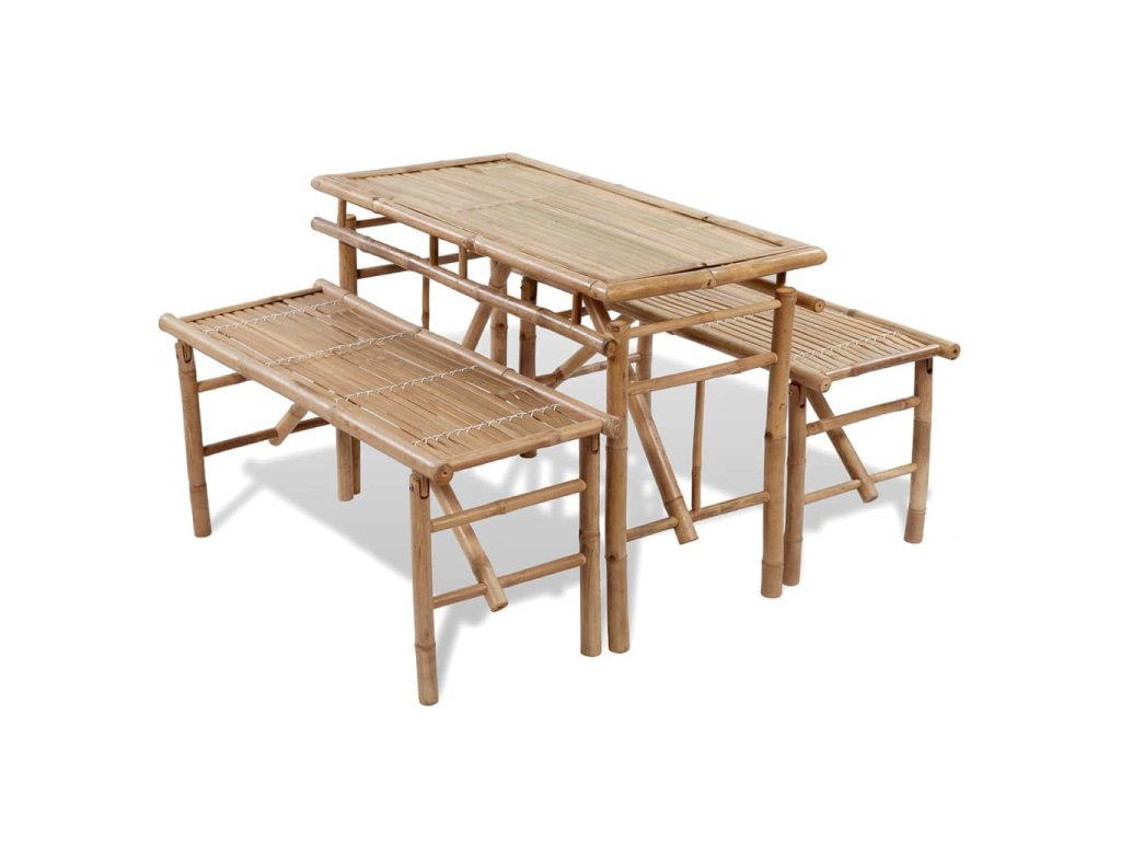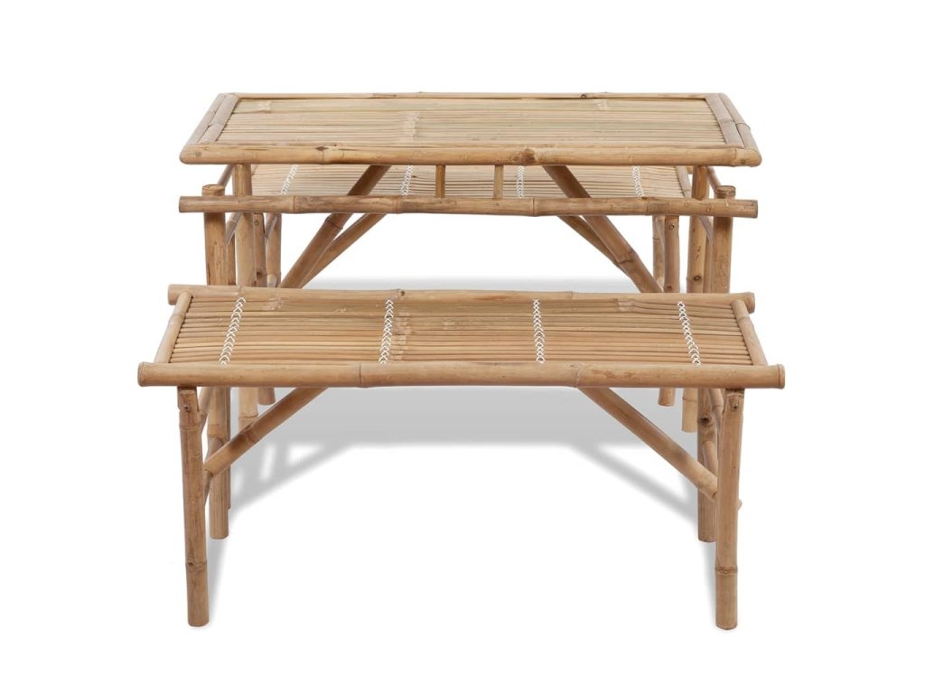 Stôl a lavice sa dajú poskladať, vďaka čomu ich môžete jednoducho preniesť a odložiť alebo opäť rozložiť. Súprava je vyrobená z bambusu, ktorý je vodovzdorný a odolný voči poveternostným vplyvom, takže má dlhú životnosť a dá sa jednoducho očistiť pomocou navlhčenej handričky.