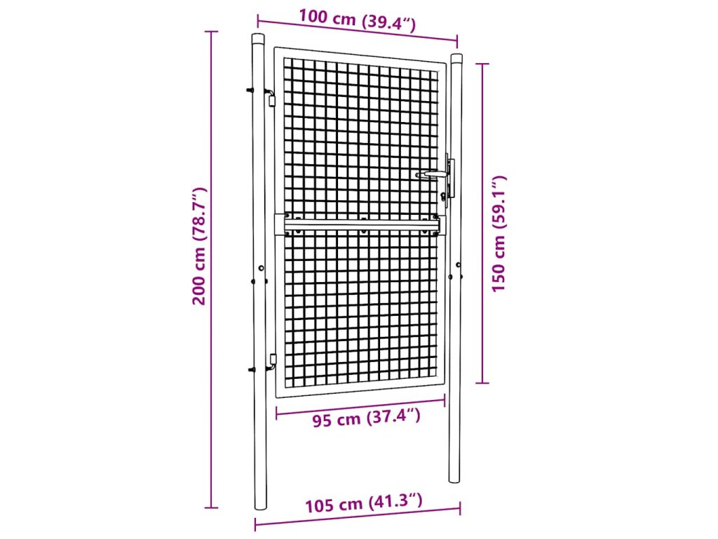 Brána je vyrobená z odolnej ocele, má pevnú konštrukciu a je ošetrená práškovou povrchovou úpravou, vďaka čomu je odolná voči hrdzi a korózii. Brána obsahuje závesné pánty a bočné stĺpiky pre jednoduchú montáž. Súčasťou balenia sú aj tri kľúče.