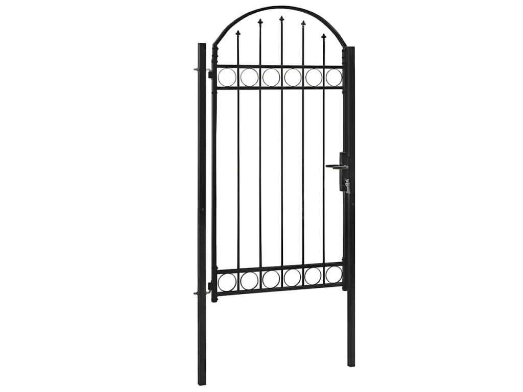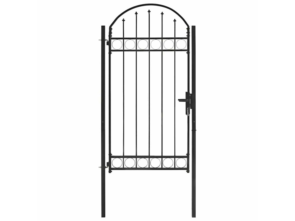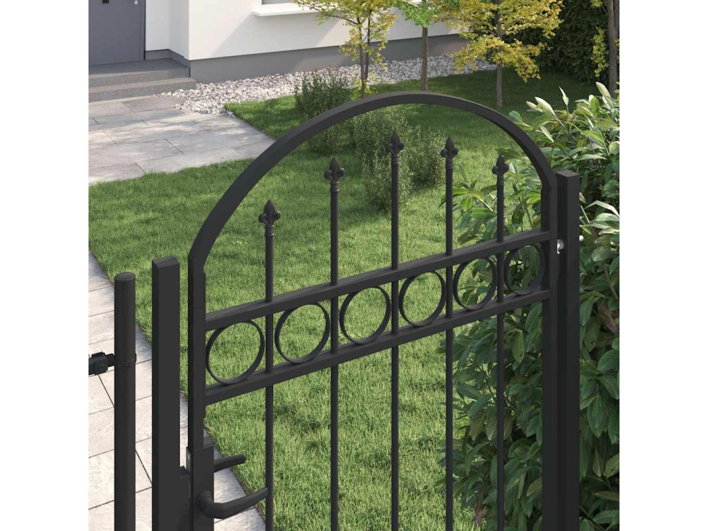 Vrchná časť záhradnej brány má elegantný zaoblený dizajn a vďaka pevným vodorovným oporným tyčiam na spevnenie rámu brána poskytuje optimálnu bezpečnosť a súkromie, a zároveň vytvára pôsobivý vstup na pozemok. Brána je vyrobená z pevnej ocele s práškovou povrchovou úpravou, ktorá je odolná voči hrdzi a korózii.