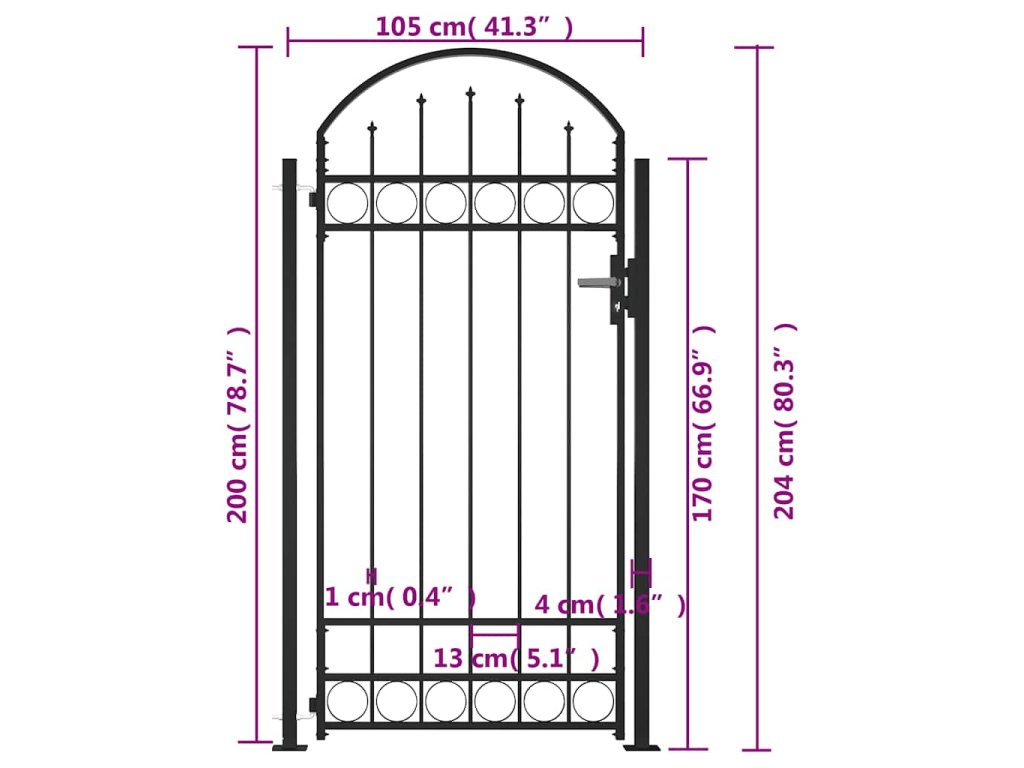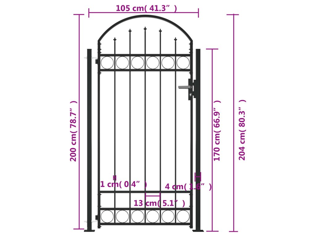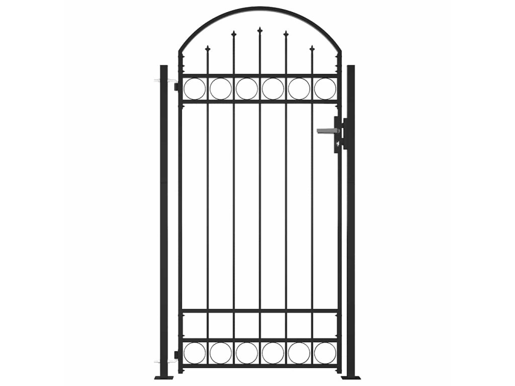 Vrchná časť záhradnej brány má elegantný zaoblený dizajn a vďaka pevným vodorovným oporným tyčiam na spevnenie rámu brána poskytuje optimálnu bezpečnosť a súkromie, a zároveň vytvára pôsobivý vstup na pozemok. Brána je vyrobená z pevnej ocele s práškovou povrchovou úpravou, ktorá je odolná voči hrdzi a korózii.