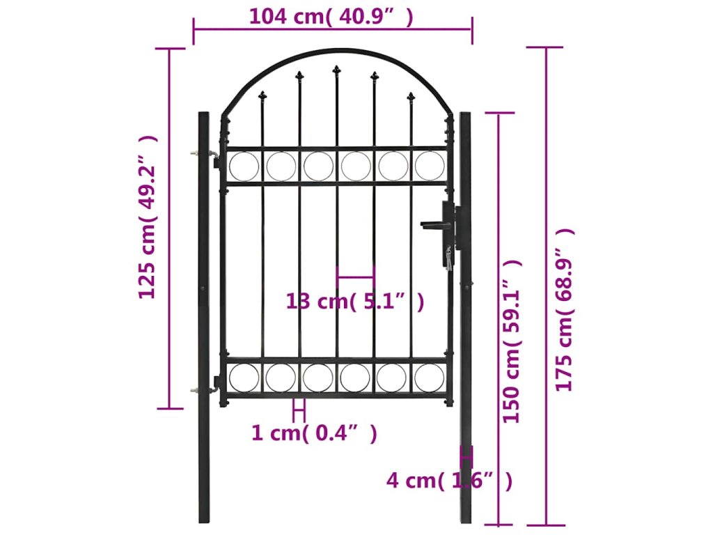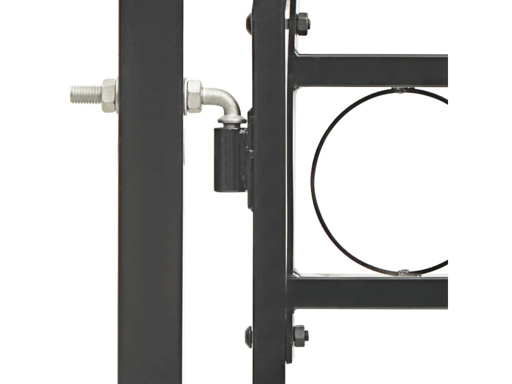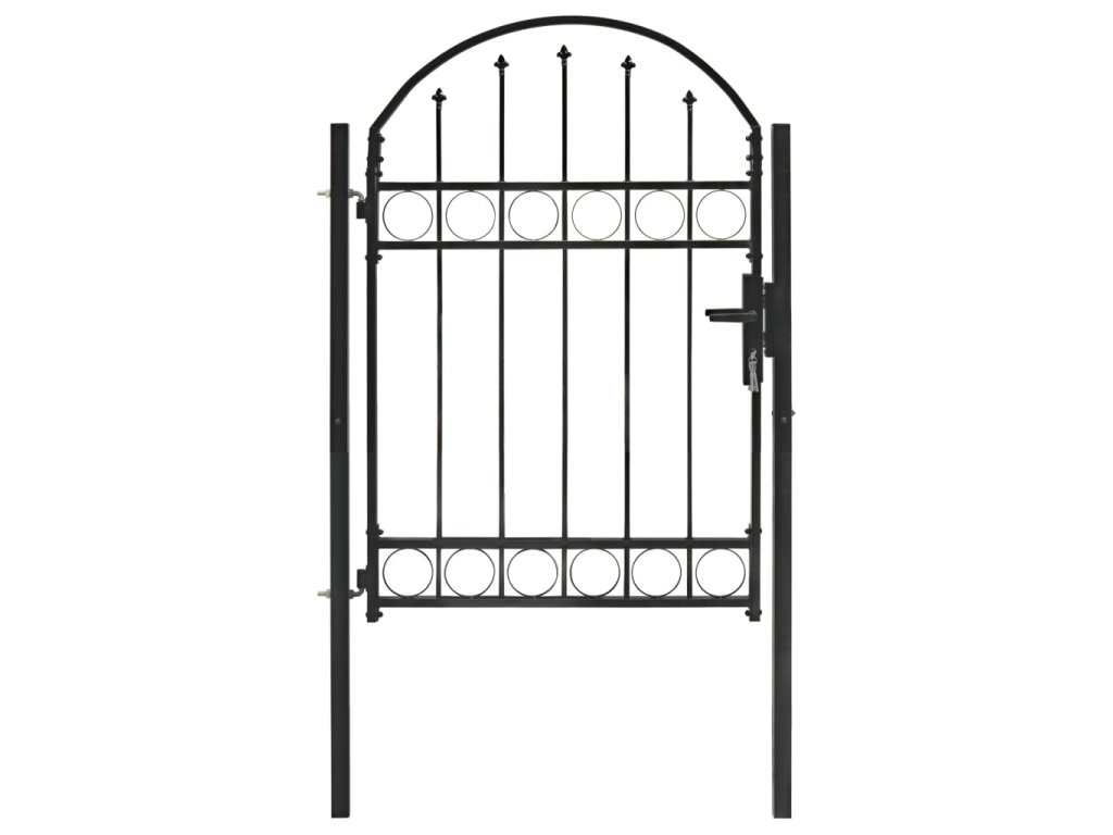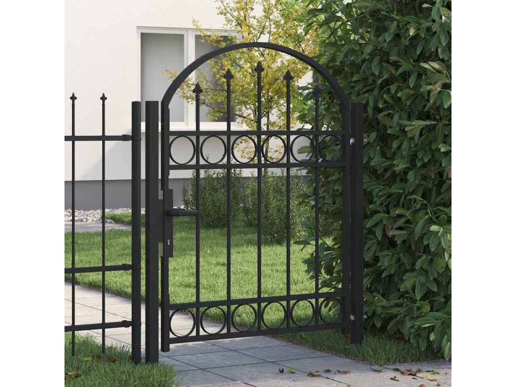 Vrchná časť záhradnej brány má elegantný zaoblený dizajn a vďaka pevným vodorovným oporným tyčiam na spevnenie rámu brána poskytuje optimálnu bezpečnosť a súkromie, a zároveň vytvára pôsobivý vstup na pozemok. Brána je vyrobená z pevnej ocele s práškovou povrchovou úpravou, ktorá je odolná voči hrdzi a korózii.