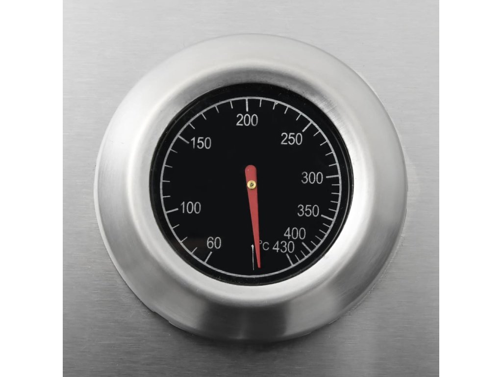Plynový gril sa vyznačuje štýlovým a funkčným dizajnom. Má veľkú varnú plochu a odolný digestor so zabudovaným teplomerom, ktorý presne zobrazuje teplotu varenia. Odkladací stolík ponúka pracovný priestor na výrobu omáčok alebo obľúbených príloh. Pribalená je tiež odnímateľná nádoba na odkvapkávanie tuku, ktorá sa ľahko čistí.