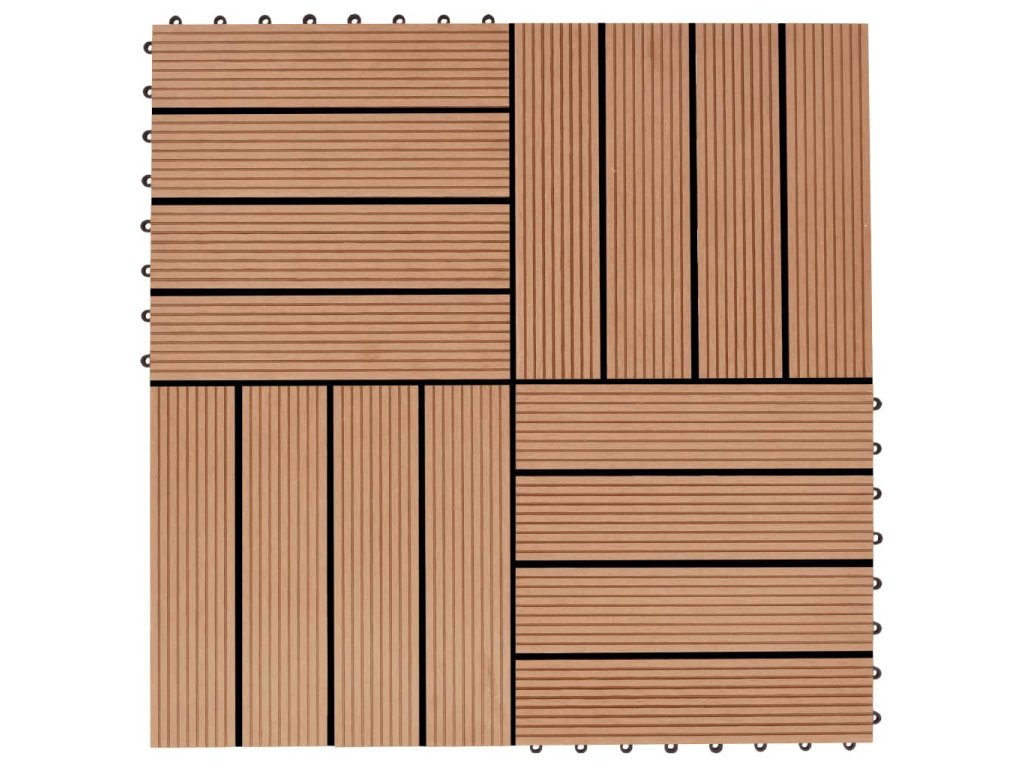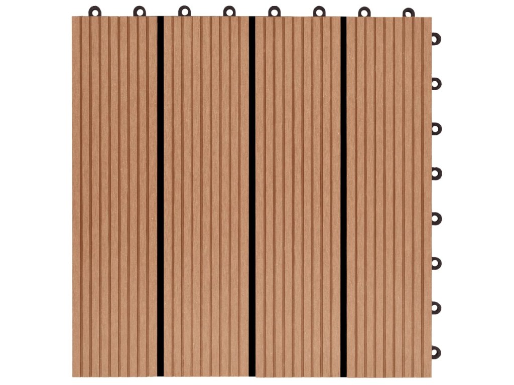 Naša dlaždicová súprava z drevoplastu sa skladá z 11 kusov dlaždíc s individuálnym rozmerom 30 x 30 cm a celkovo pokrýva plochu 1 meter štvorcový. Bude dokonalá pre terasy, balkóny, kúpeľne alebo k vášmu bazénu či vírivke.