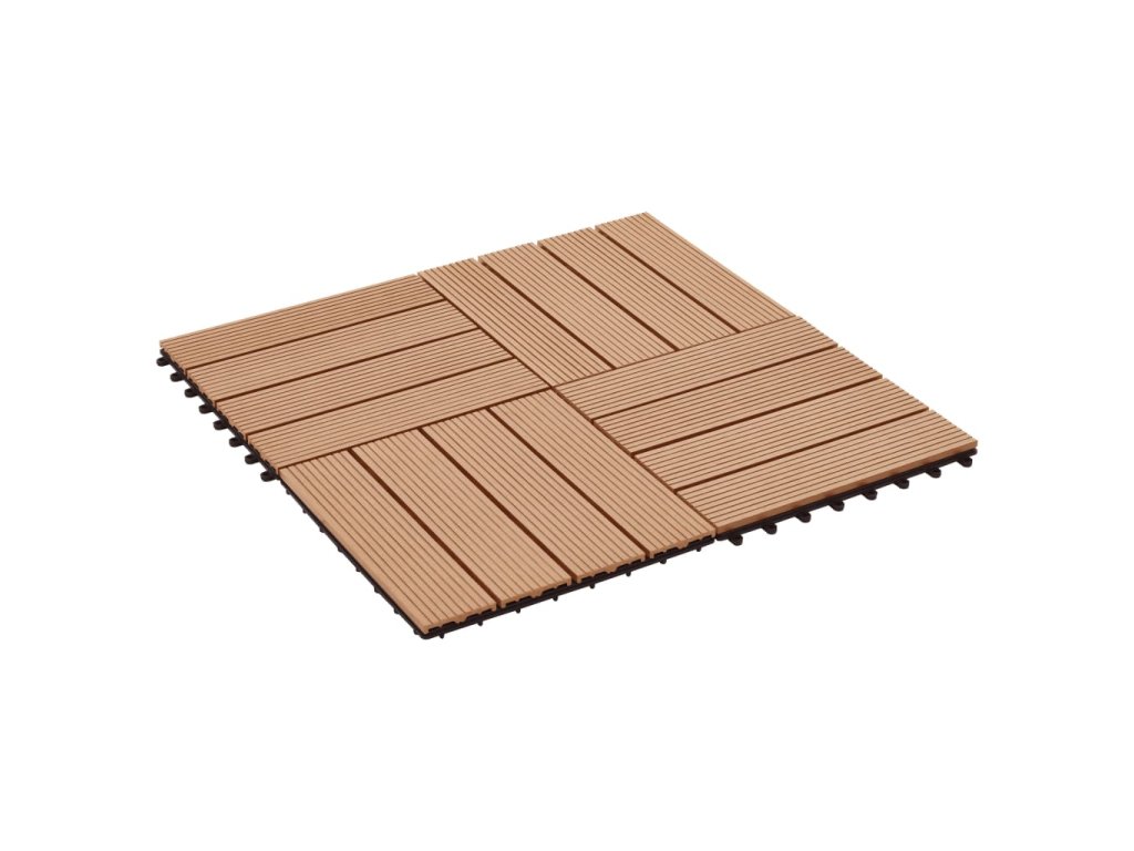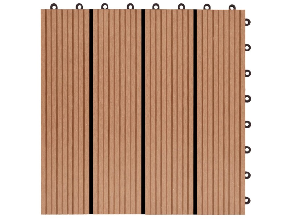 Táto sada pozostáva z 22 podlahových dosiek z WPC s rozmerom 30 x 30 cm a celkovo pokrýva plochu 2 metrov štvorcových. Je ako stvorená na terasy, balkóny, do kúpeľní alebo k bazénu či vírivke.