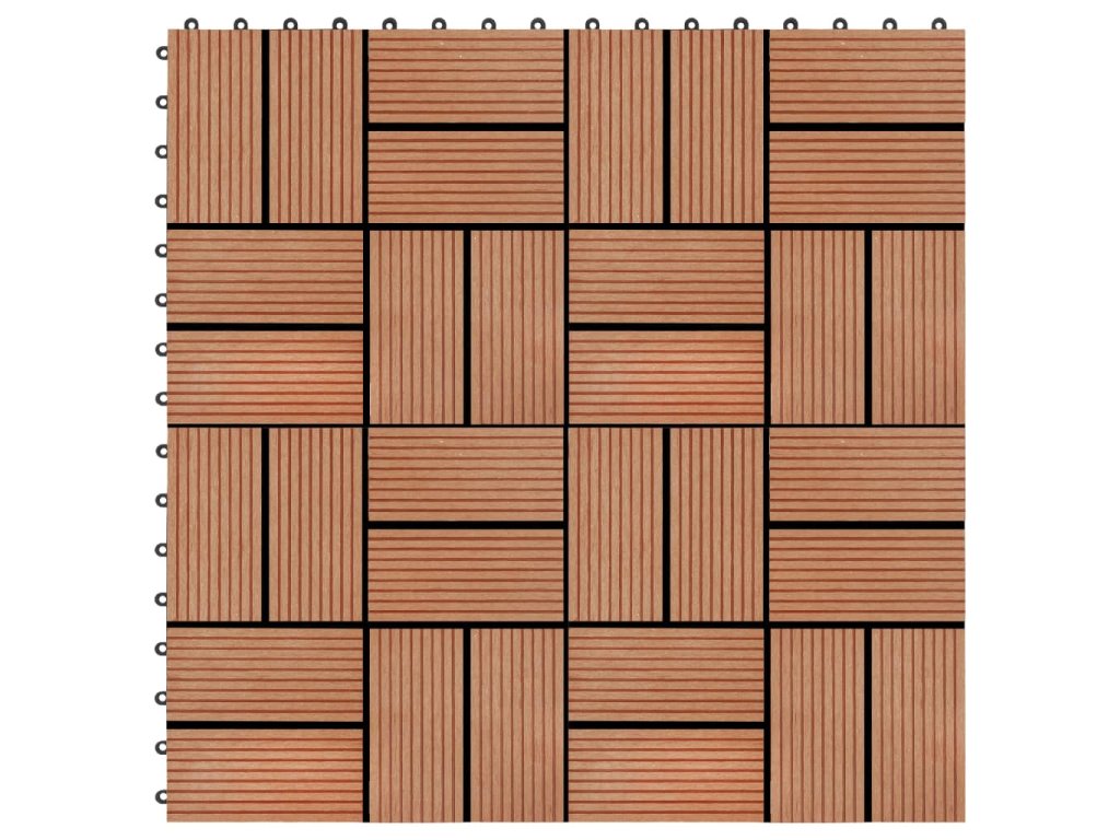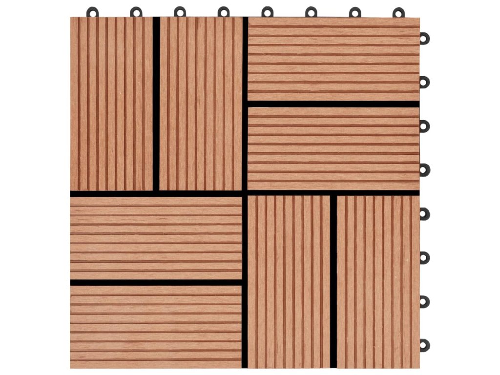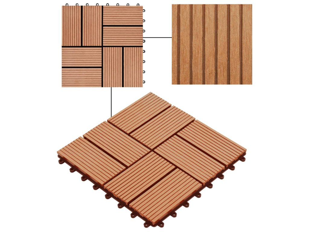 Táto sada pozostáva z 22 podlahových dosiek z WPC s rozmerom 30 x 30 cm a celkovo pokrýva plochu 2 metrov štvorcových. Je ako stvorená na terasy, balkóny, do kúpeľní alebo k bazénu či vírivke.
