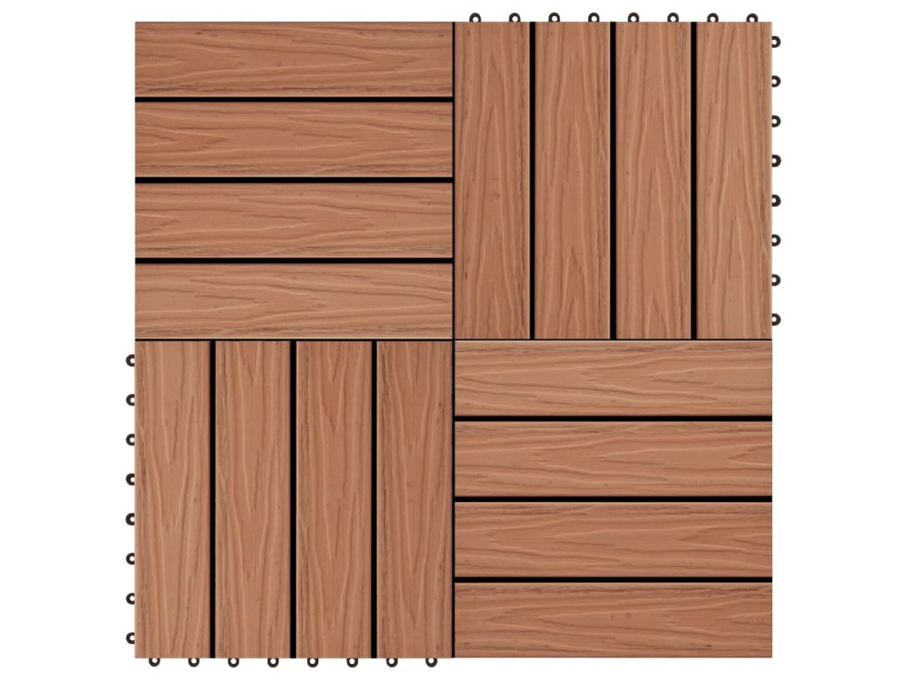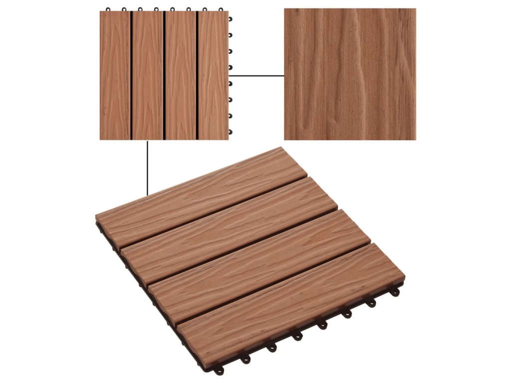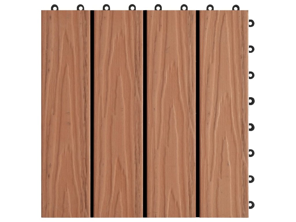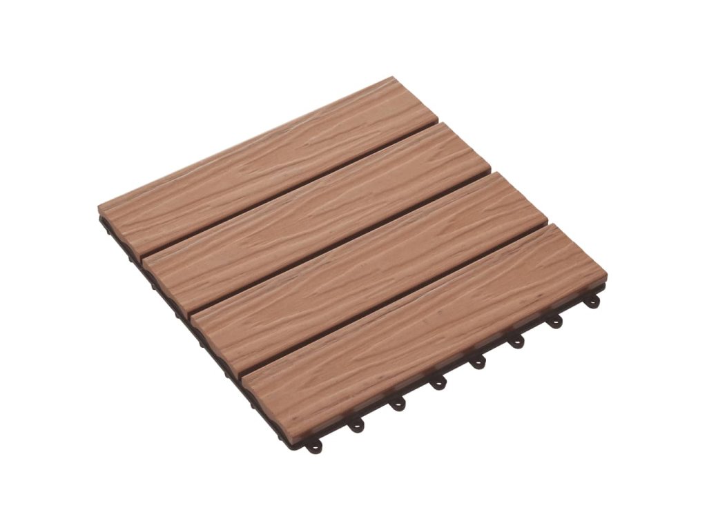 Sada hlboko reliéfnych dlaždíc z WPC obsahuje 11 dlaždíc, pričom každá má rozmery30 x 30 cm, a pokrýva celkovú plochu 1 meter štvorcový. Vašej terase, balkónu, kúpeľni, bazénu či domácemu wellness dodá čistý vzhľad.