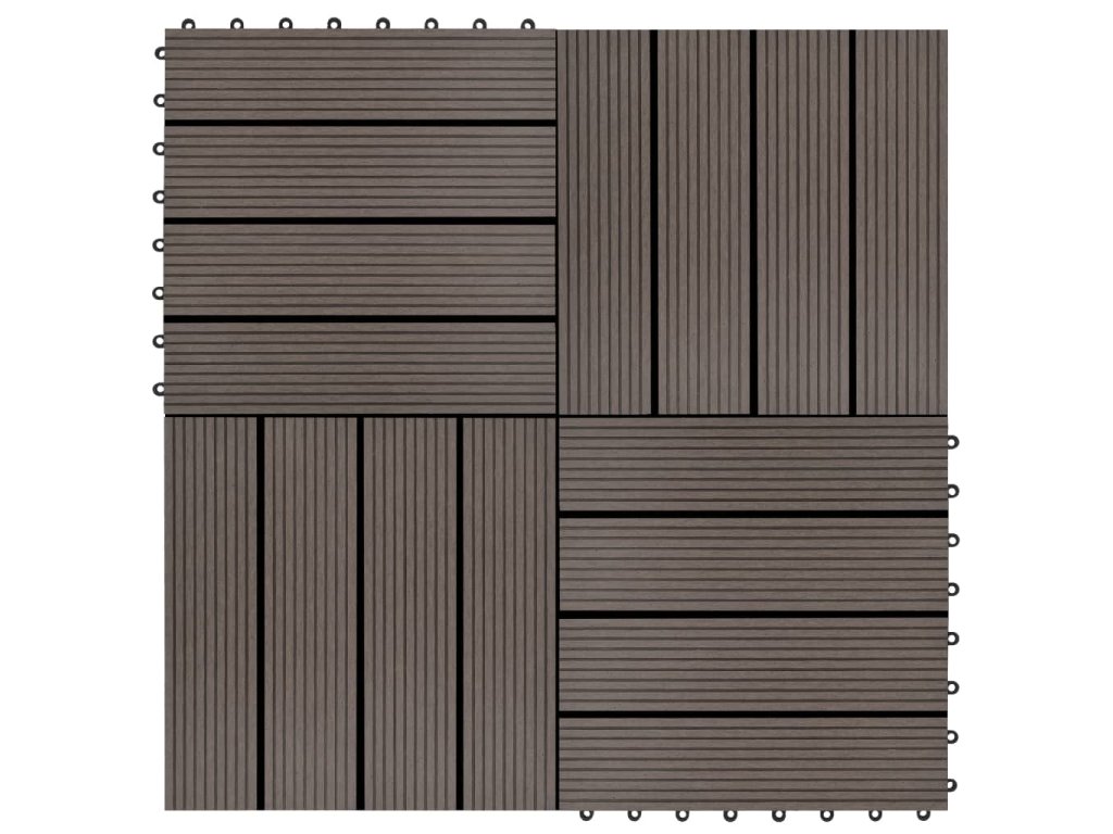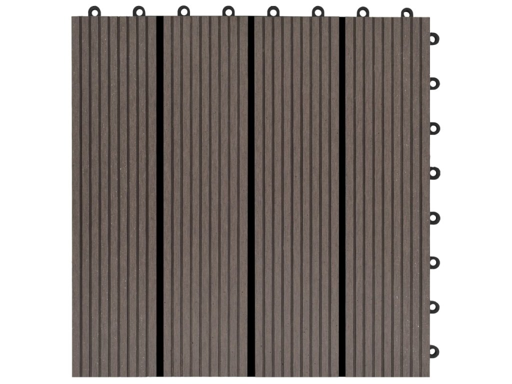 Naša dlaždicová súprava z drevoplastu sa skladá z 11 kusov dlaždíc s individuálnym rozmerom 30 x 30 cm a celkovo pokrýva plochu 1 meter štvorcový. Bude dokonalá pre terasy, balkóny, kúpeľne alebo k vášmu bazénu či vírivke.