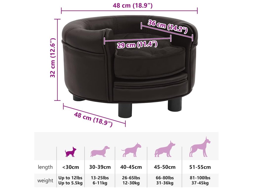 Pohovka pre domáce zvieratá má hustú výplň a drevený rám s poťahom z umelej kože, ktorý sa ľahko čistí, a tak sa na nej vášmu štvornohému kamarátovi bude odpočívať naozaj pohodlne. Prateľný poťah podložky je vyrobený z na dotyk mäkkého plyšu pre vačší komfort. Drevené nohy s protišmykovým dizajnom dodávajú celej konštrukcii potrebnú stabilitu a pevnosť. Vonkajšie telo je taktiež mimoriadne odolné, a tak vášmu zvieratku poskytne bezpečné miesto na oddych.