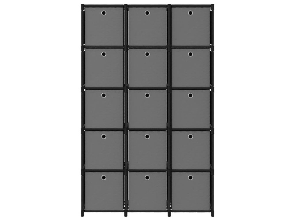 Úložný stojan je vyrobený z tkaniny a oceľového rámu, vďaka čomu je pevný a stabilný. Táto samostatne stojaca polica má 15 otvorených priehradiek a každá priehradka obsahuje látkový box, ktorý poskytuje dostatok úložného priestoru pre vaše veci a udržuje vašu izbu upratanú. Regál na domáce použitie navyše slúži ako ideálne miesto na uloženie kníh, zberateľských predmetov, fotografií, ocenení a malých rastlín v kvetináčoch, keď vyberiete boxy.