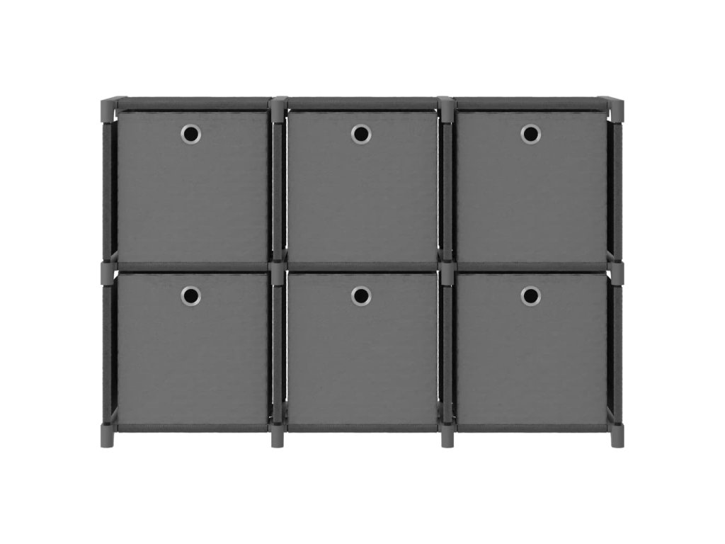 Úložný stojan je vyrobený z tkaniny a oceľového rámu, vďaka čomu je pevný a stabilný. Táto samostatne stojaca polica má 6 otvorených priehradiek a každá priehradka obsahuje látkový box, ktorý poskytuje dostatok úložného priestoru pre vaše veci a udržuje vašu izbu upratanú. Regál na domáce použitie navyše slúži ako ideálne miesto na uloženie kníh, zberateľských predmetov, fotografií, ocenení a malých rastlín v kvetináčoch, keď vyberiete boxy.