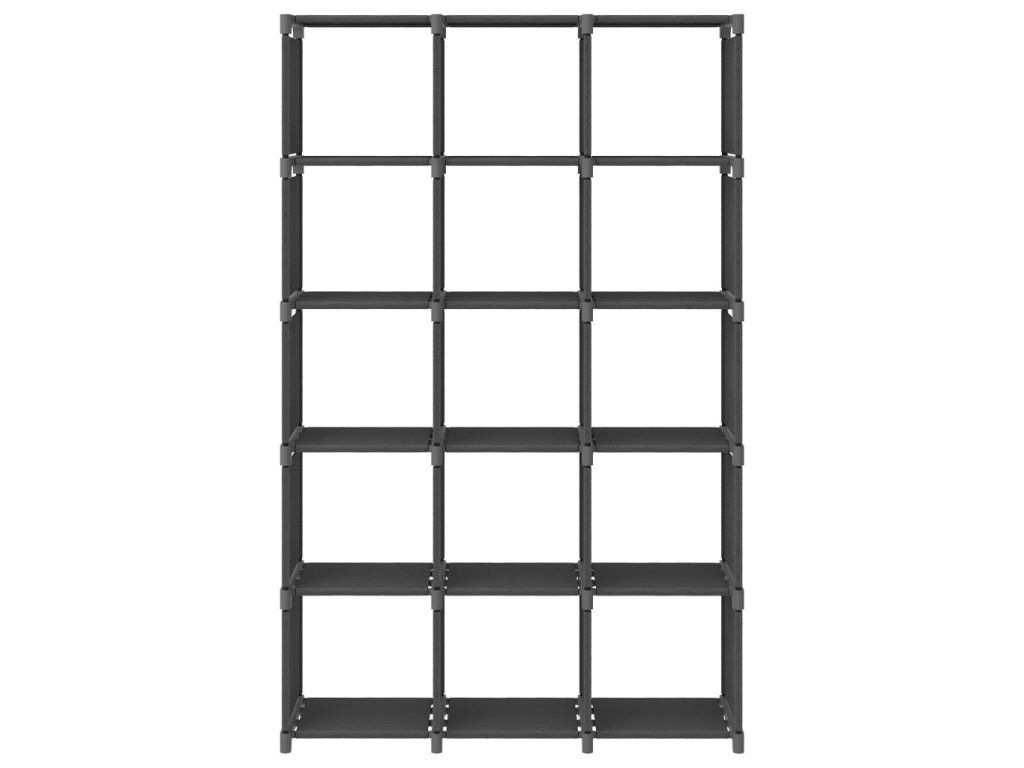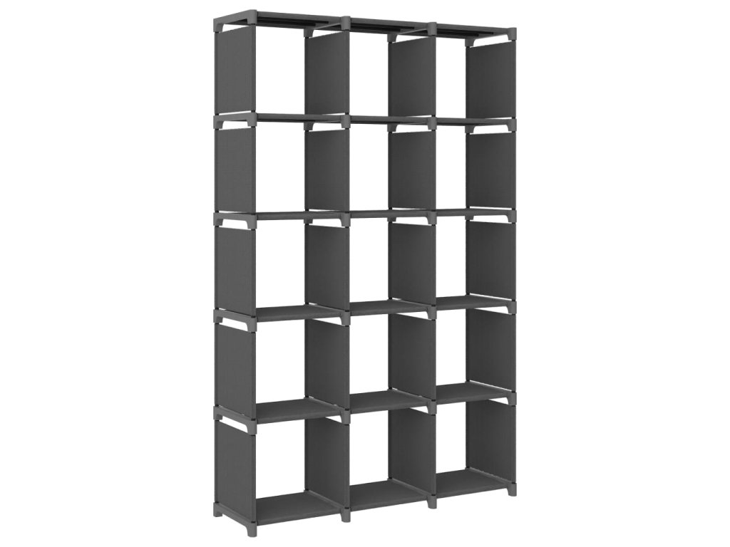 Úložný regál je vyrobený z tkaniny a oceľového rámu, vďaka čomu je pevný a stabilný. Táto samostatne stojaca polica má 15 otvorených priehradiek a môže slúžiť ako ideálne miesto na vystavenie kníh, zberateľských predmetov, fotografií, ocenení, malých rastlín v kvetináčoch, atď.