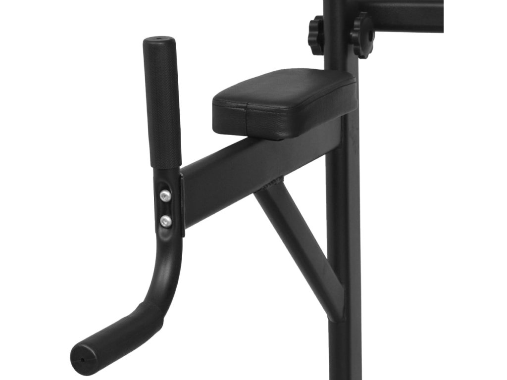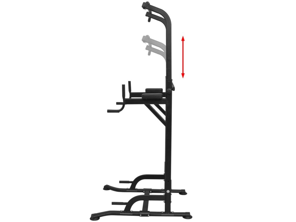 Túto multifunkčnú vežu môžu používať ľudia s hmotnosťou do 160 kg. Veža je výškovo nastaviteľná od 182 cm do 235 cm. Lavička na brušáky a opierky nôh sú hrubšie polstrované pre pohodlnejší a ľahší tréning. Robustný rám veže má čierny práškový lak a lavička a podušky na opierkach nôh majú povrch z PU.