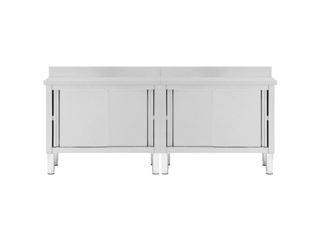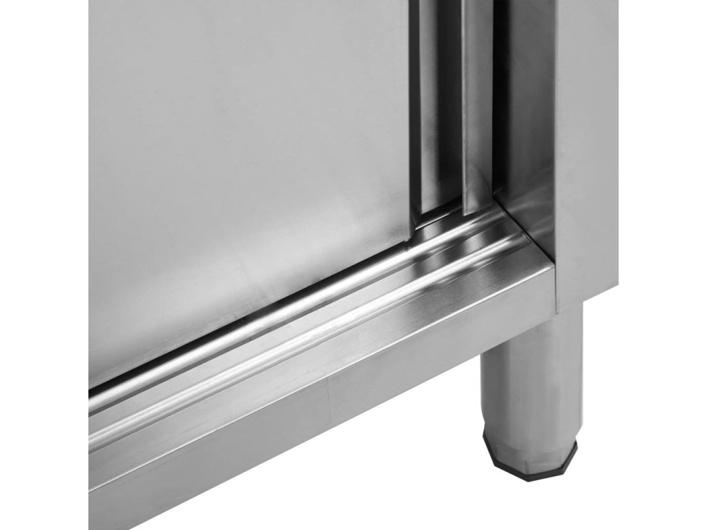 Kuchynská skrinka je vyrobená z nehrdzavejúcej ocele a je mimoriadne trvácna, stabilná a ľahko sa čistí, vďaka čomu je ideálna pre použitie tam, kde sa vyžaduje vysoký hygienický štandard. Vďaka priestrannému úložnému priestoru pod kuchynskou skrinkou bude vaša kuchyňa usporiadanejšia a čistejšia. Dizajn posuvných dverí navyše zaručuje pohodlný prístup ku všetkým potrebným ingredienciám.