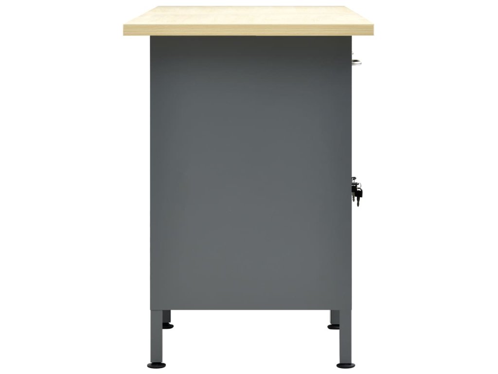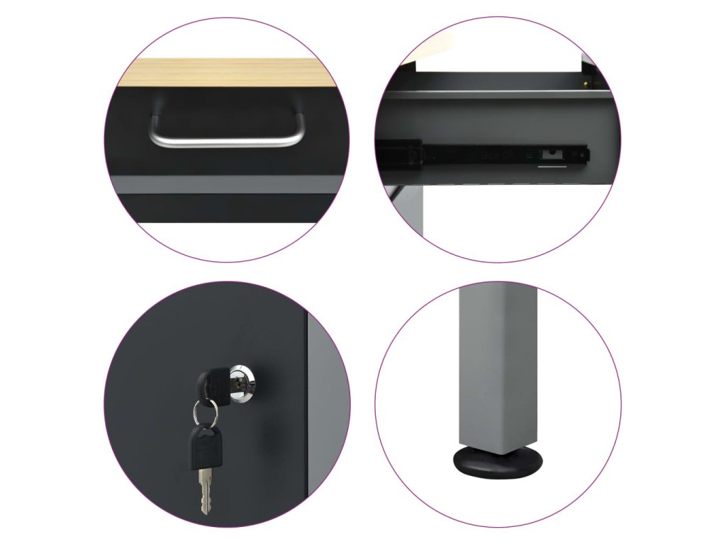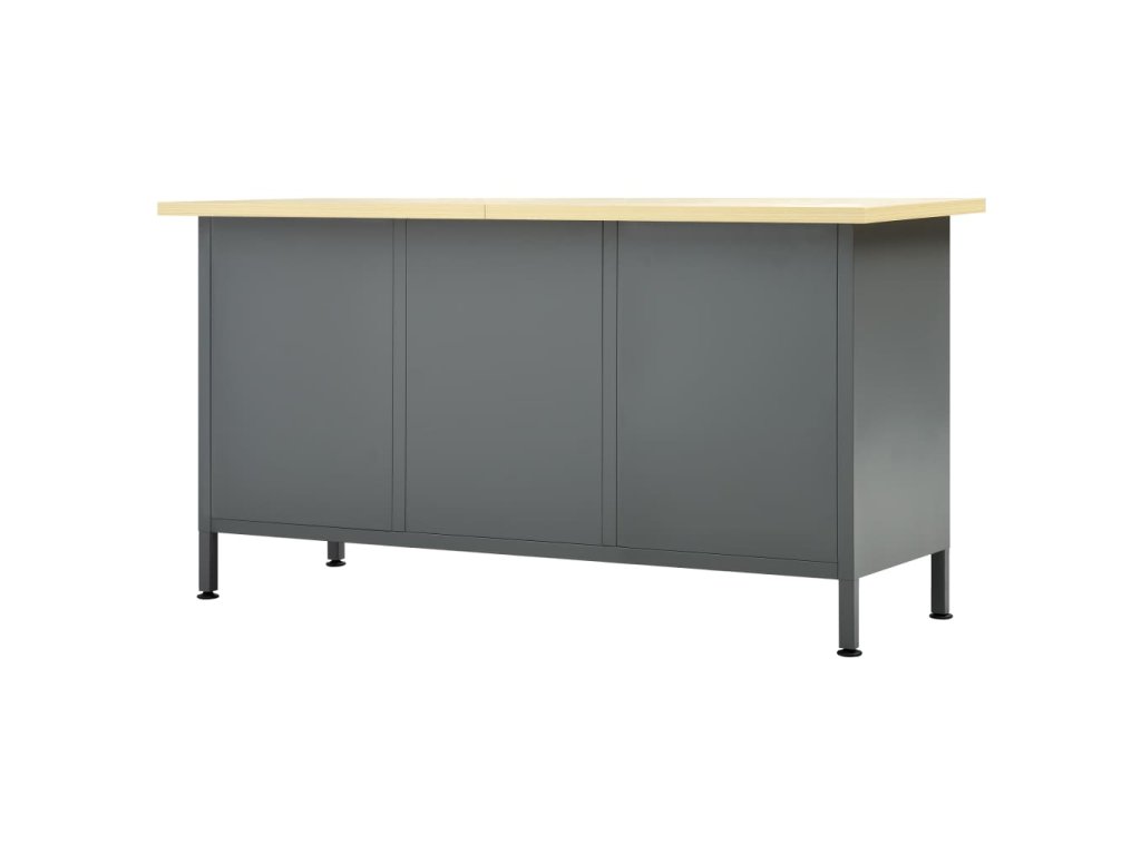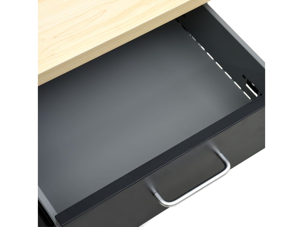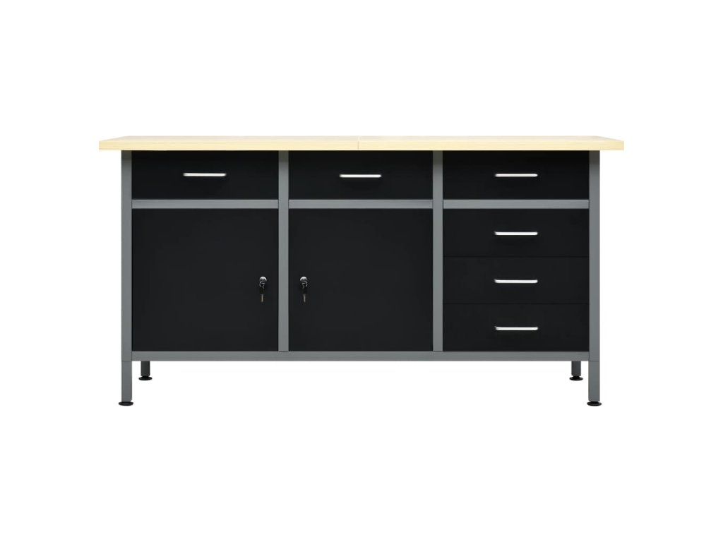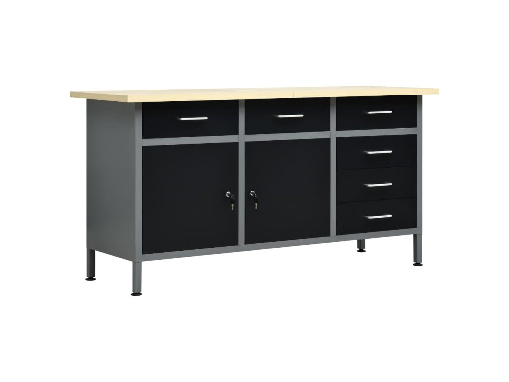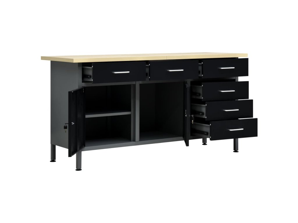 Veľká a robustná stolová doska poskytuje stabilnú platformu pre všetky opravy. Pracovný stôl má 6 zásuviek, vďaka čomu môžete usporiadať svoje náradie, diely a príslušenstvo, ako sú skrutky, klince a lepiace pásky. Všetky zásuvky sú vybavené mechanizmom s guľôčkovým ložiskom pre hladké kĺzanie. K dispozícii sú vhodné priehradky pre väčšie nástroje, 2 skrinky s uzamykateľnými dverami, do ktorých sa zmestia vŕtačky, káblové bubny a brúsky.