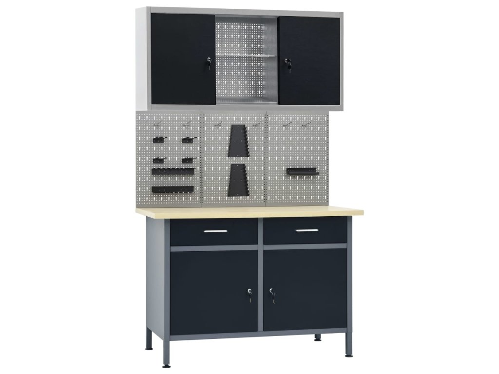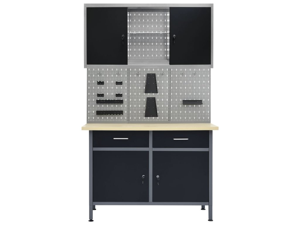 Táto sada je kombináciou 1 pracovného stola, 4 nástenných panelov a 2 nástenných skriniek, ktoré budú praktickým riešením pre vašu dielňu alebo garáž.