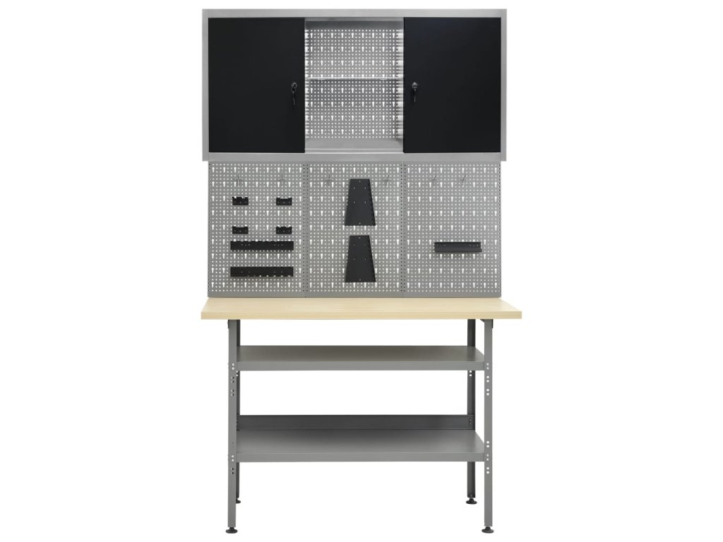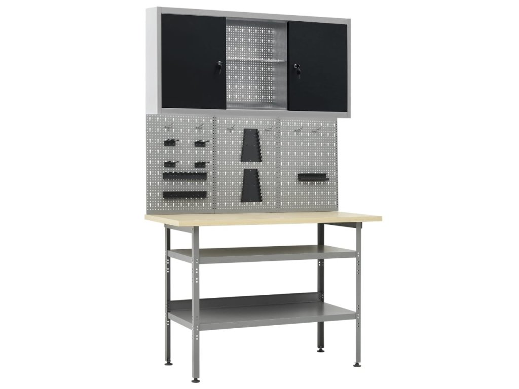Táto sada je kombináciou 1 pracovného stola, 4 nástenných panelov a 2 nástenných skriniek, ktoré budú praktickým riešením pre vašu dielňu alebo garáž.