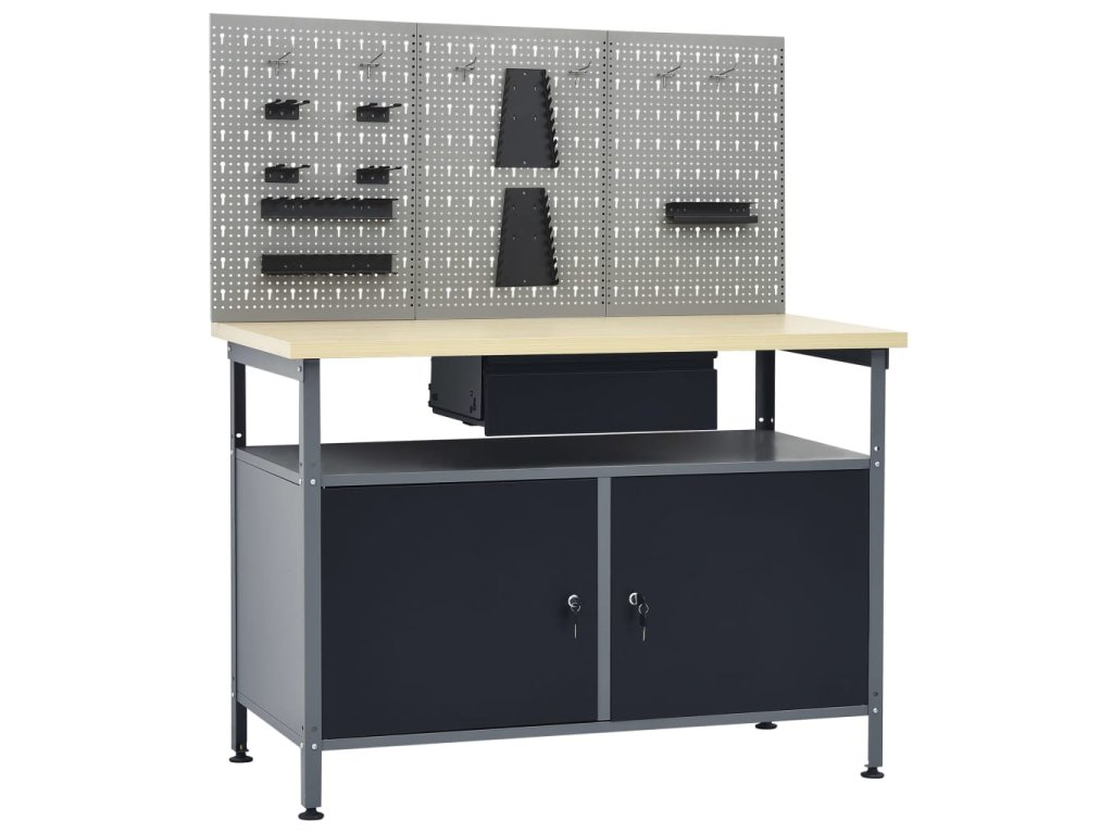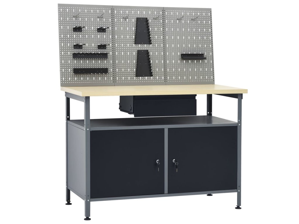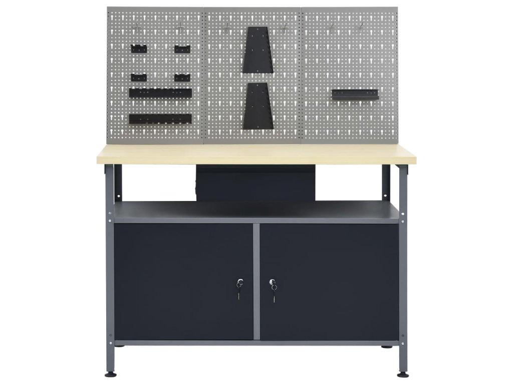 Tento odolný pracovný stôl vyniká svojím veľkorysým úložným priestorom a nosnosťou 300 kg. Pracovný stôl má otvorený priečinok so zásuvkou, kam si budete môcť prehľadne usporiadať náradie, diely a rôzne príslušenstvo, ako napríklad skrutky, klince, či lepiace pásky. Stôl obsahuje aj 2 police a veľký priečinok s 2 uzamykateľnými dvierkami na odkladanie vŕtačiek, bubnov s káblami či brúsok. Nožičky sú navyše výškovo nastaviteľné. Táto pracovná stanica je vyrobená z prvotriednej ocele a kompozitného dreva, vďaka čomu je mimoriadne pevná, trvácna a ľahko sa čistí. Jednoducho sa montuje.