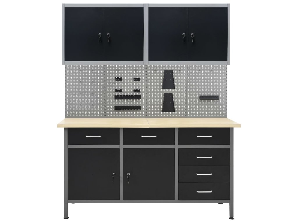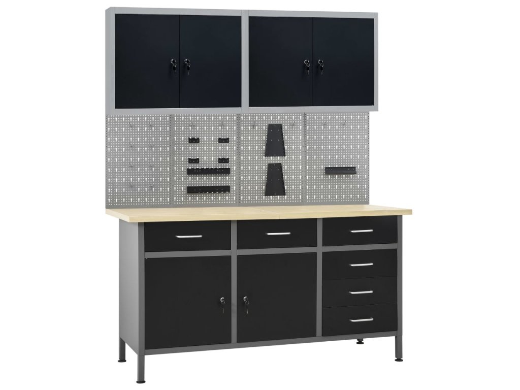Táto sada je kombináciou 1 pracovného stola, 4 stenových panelov a 2 nástenných skriniek, ktoré budú praktickým riešením pre vašu dielňu alebo garáž.