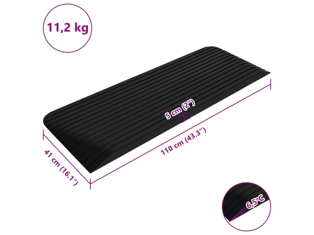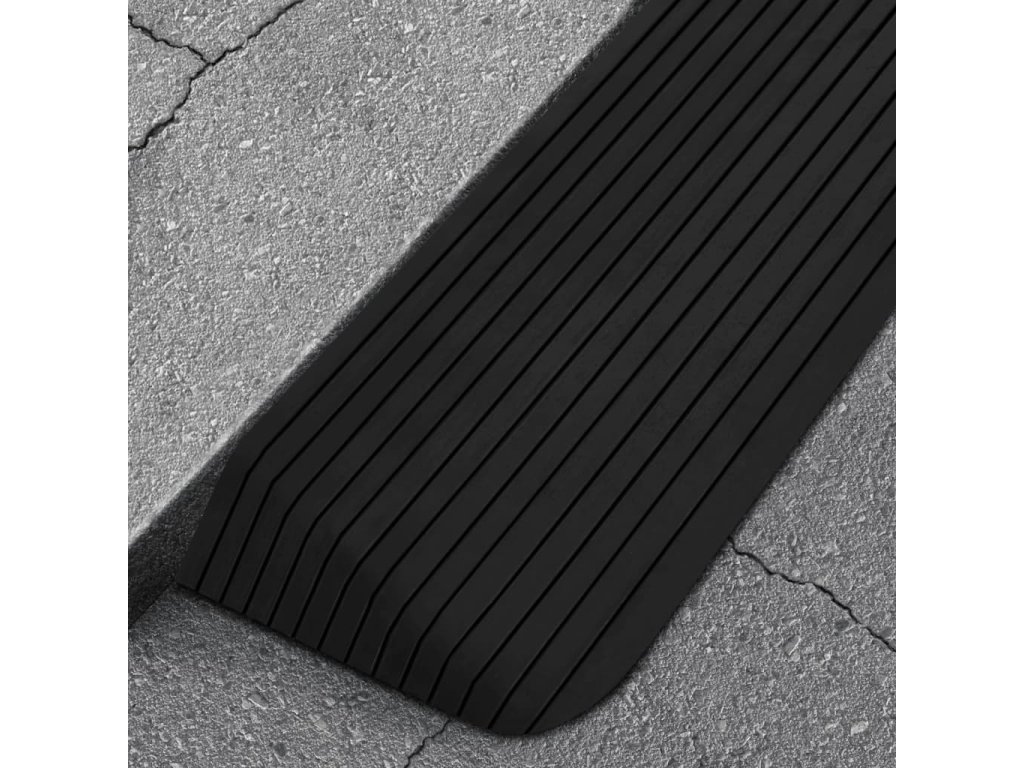 Nájazdová rampa je vyrobená z pevnej gumy, vďaka čomu je ľahká, pevná a odolná pre dlhodobé používanie. Drsný povrch má nekĺzavú štruktúru, aby sa zabránilo pošmyknutiu, alebo prekĺzavaniu pri pohybe do kopca.