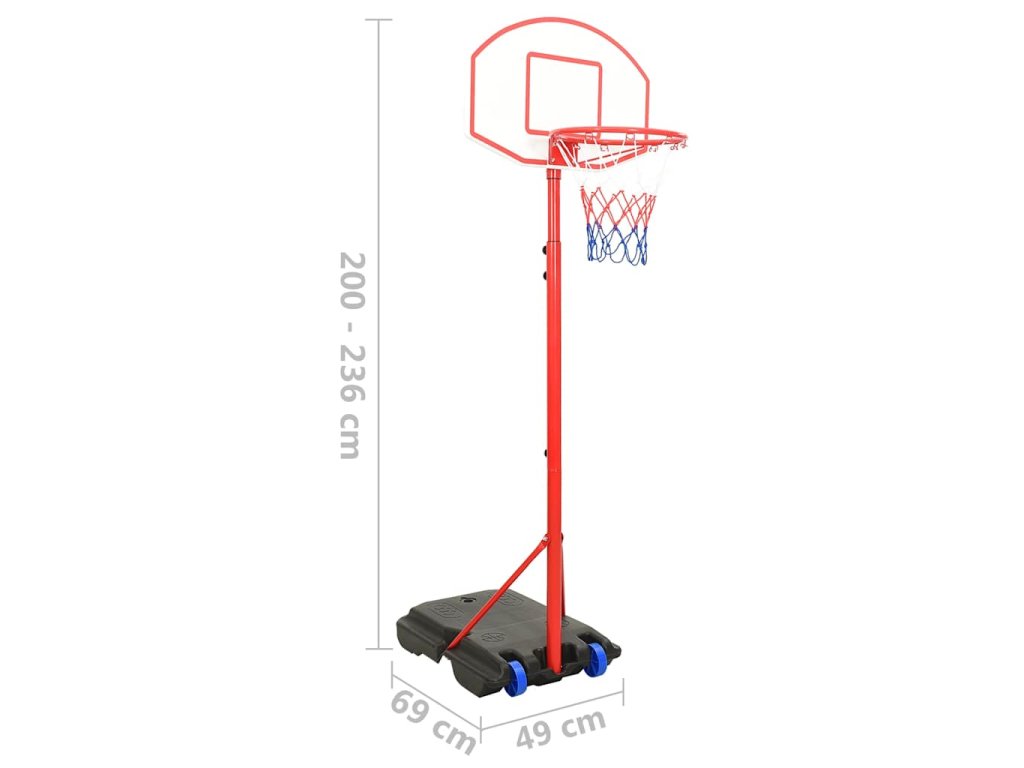 Táto súprava je dodávaná spolu so železnou obručou, 3-farebnou sieťkou, nafukovacou basketbalovou loptou a pumpou. Budete mať úplne všetko potrebné na hranie! Výška basketbalového koša sa dá nastaviť podľa výšky vášho dieťaťa. Po naplnení vodou alebo pieskom základňa stojí pevne na zemi. Vďaka svojej ľahkej hmotnosti a podstavcu s kolieskami sa dá súprava jednoducho presúvať.