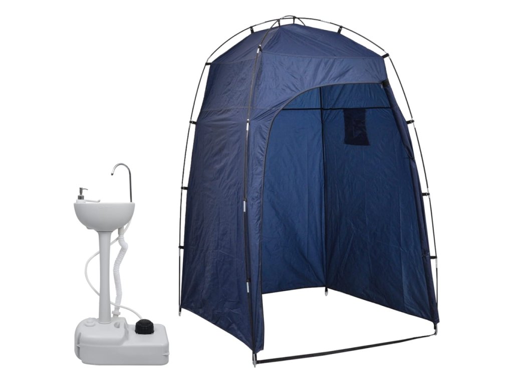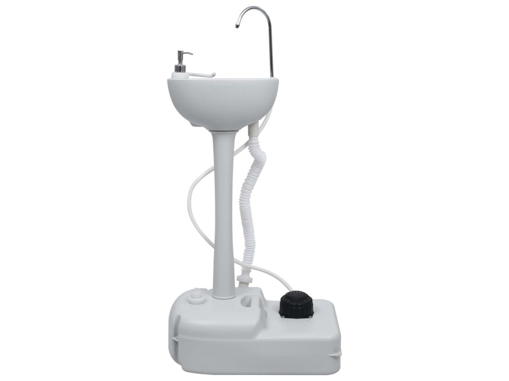 Kempingové umývadlo sa dodáva spolu so stanom, ktorý vám vonku poskytne dostatočné súkromie. Sklolaminátová tyč prináša potrebnú stabilitu a krytá strieška vytvára väčšie súkromie pri umývaní alebo prezliekaní v prírode. Stojan na umývanie rúk je vybavený 3-litrovým dávkovačom mydla, držiakom na uterák a 17-litrovou nádržou na sladkú vodu. Prúd vody spustíte pomocou nožného pedálu bez použitia rúk. Umývadlo je navyše vybavené dvoma zabudovanými kolieskami na jednoduchú prepravu.