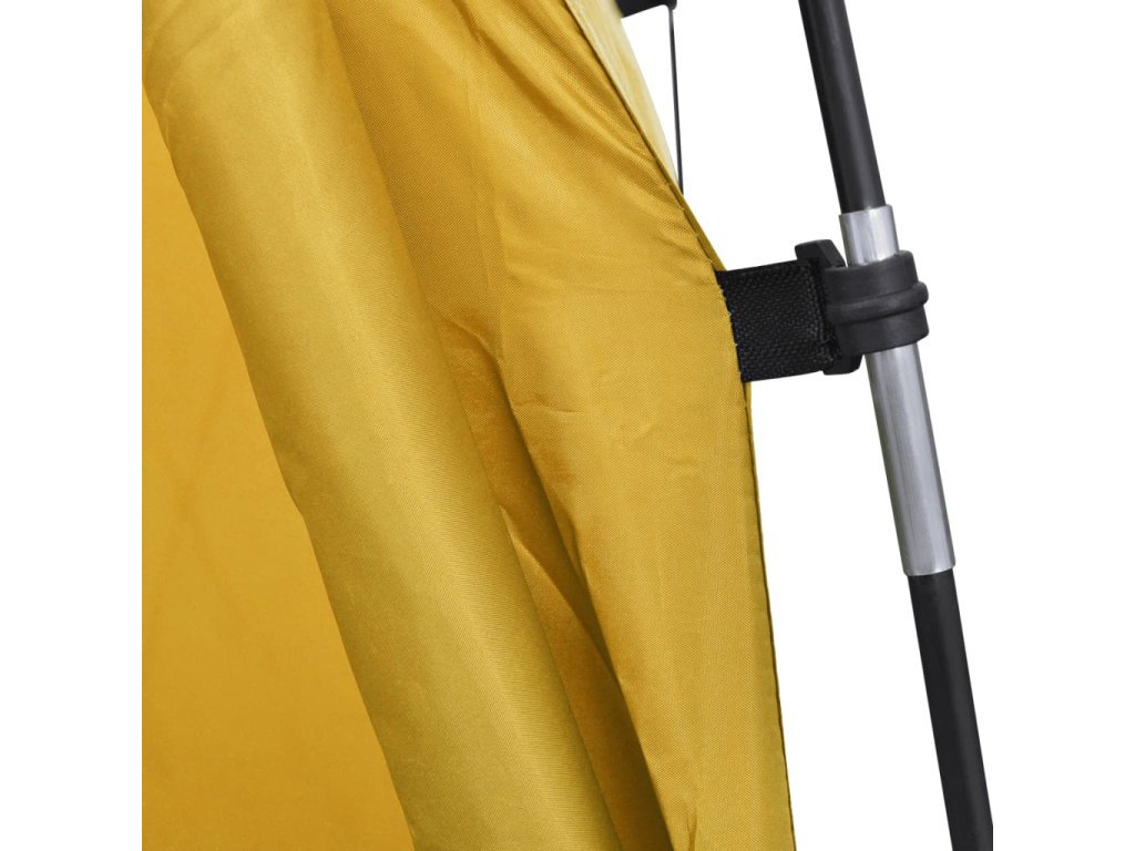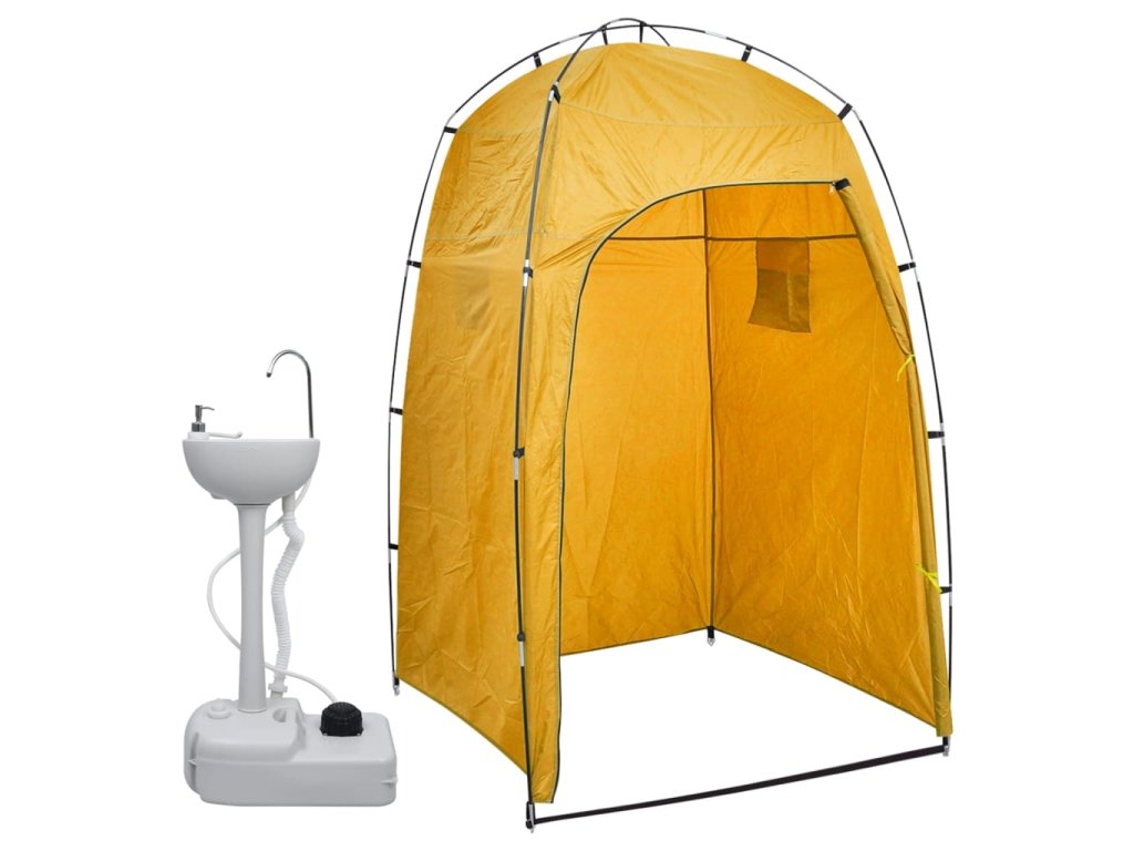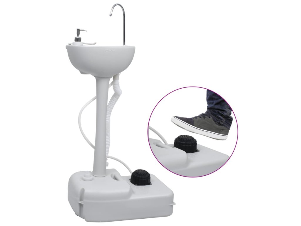 Kempingové umývadlo sa dodáva spolu so stanom, ktorý vám vonku poskytne dostatočné súkromie. Sklolaminátová tyč prináša potrebnú stabilitu a krytá strieška vytvára väčšie súkromie pri umývaní alebo prezliekaní v prírode. Stojan na umývanie rúk je vybavený 3-litrovým dávkovačom mydla, držiakom na uterák a 17-litrovou nádržou na sladkú vodu. Prúd vody spustíte pomocou nožného pedálu bez použitia rúk. Umývadlo je navyše vybavené dvoma zabudovanými kolieskami na jednoduchú prepravu.