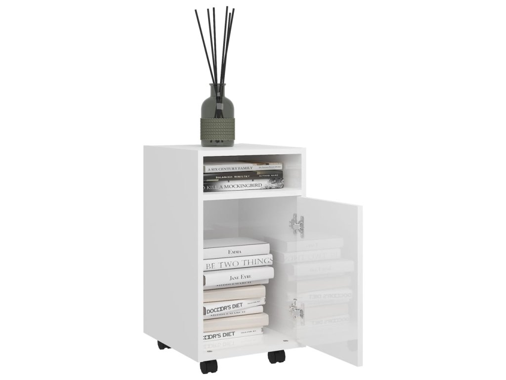 Táto stojaca skrinka s poličkou a priehradkou ponúka dostatok úložného priestoru, vďaka ktorému budete mať svoje potrebné veci dobre zorganizované a na dosah. Horná vrstva poskytuje stabilný povrch, kam môžete umiestniť nápoje, knihy alebo ozdobné predmety. Dvere priehradky je možné nainštalovať vľavo alebo vpravo podľa vašich osobných návykov a pohodlia. Tento príručný stolík je možné ľahko premiestniť na požadované miesto pomocou štyroch otočných koliesok. A kolesá sú uzamykateľné, čo udržuje skrinku na svojom mieste a dodáva jej stabilitu. Táto skrinka sa navyše ľahko čistí aj vlhkou handričkou.