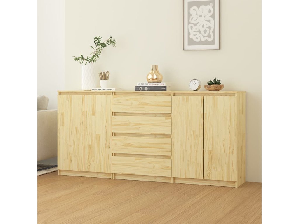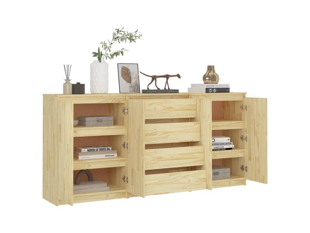 Tieto nočné stolíky sú vyrobené z masívneho borovicového dreva, čo zaisťuje ich pevnosť a odolnosť. Pozostávajú z 2 skriniek s 2 dvierkami a 3 priehradkami, 1 skrinky so 4 zásuvkami. Poskytujú dostatok úložného priestoru, aby ste mali rôzne predmety dobre organizované a na dosah ruky. Pevná doska je tiež ideálna na vystavenie dekoratívnych predmetov, fotorámikov alebo rastlín v črepníkoch. Tieto nočné skrinky sa navyše ľahko čistia vlhkou handričkou.