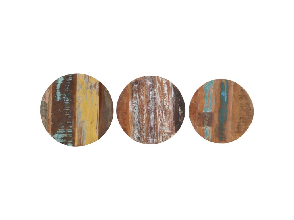 Doska stolíka je vyrobená z recyklovaného masívu pochádzajúceho z trámov, podláh a nosných trámov zo starých zbúraných budov. Môže pozostávať z rôznych druhov dreva, ako je borovica, teak, dubové drevo, mangovníkové drevo, akáciové drevo atď. To znamená, že regenerované drevo si zachováva vlastnosti týchto rôznych druhov dreva. Drevo je už odležané, zvetrané a vysušené, preto sa nezmršťuje ani neohýba. Pevná stolová doska navyše poskytuje stabilný a bezpečný povrch, na ktorý môžete umiestniť rôzne predmety. Práškovaný lakovaný železný podstavec zvyšuje stabilitu stola. Stolíky môžete dať k sebe alebo oddeliť, aby vyhovovali vašim potrebám, a navzájom ich vnoriť, aby ste ušetrili miesto, keď sa nepoužívajú.