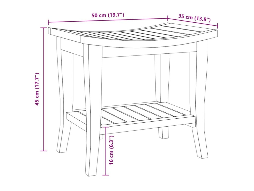 - Úložná polička: Tíkový príručný stolík má nosnosť až 10 kg, a tak je ako stvorený na odkladanie rôznych toaletných potrieb, ako sú osušky, mydlá, šampóny, krémy, sprchové gély či vonné sviečky, ktoré tak budete mať hneď poruke. Stolík nie je v žiadnom prípade vhodný na sedenie. Stolík nie je v žiadnom prípade vhodný na sedenie.