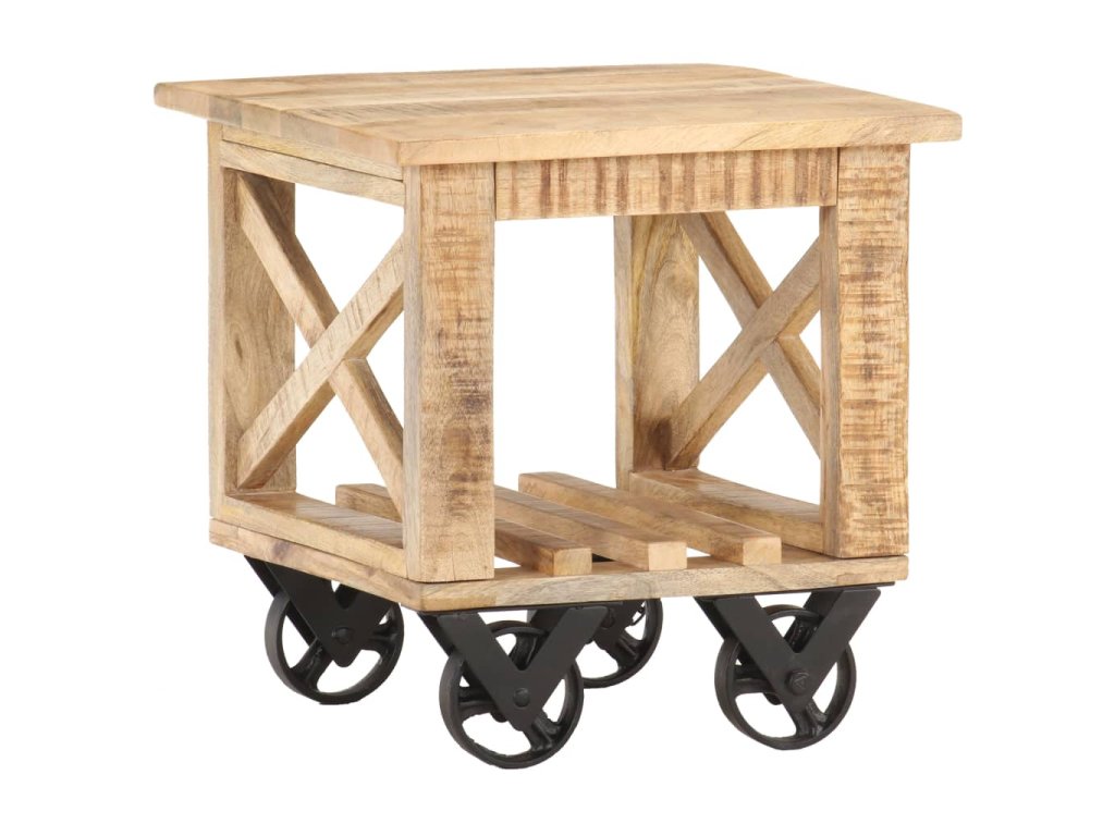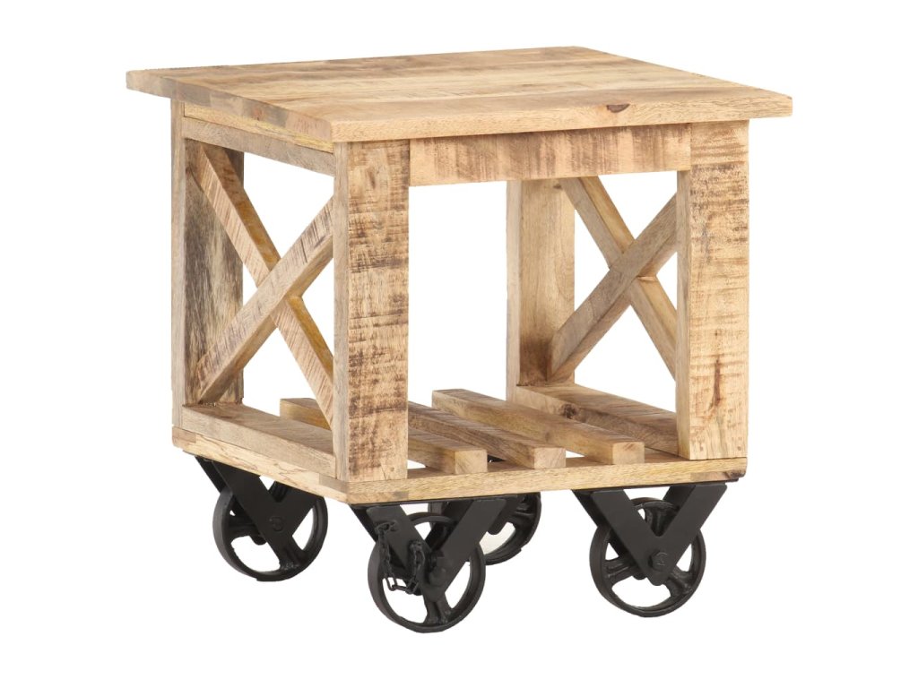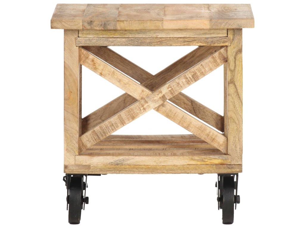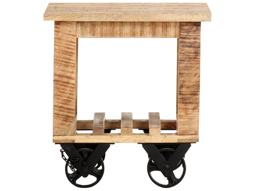 Stôl je vyrobený zo surového mangového masívu, ktorý je pevný, trvácny a krásny, a profesionálne opracovanie len umocňuje jeho pôsobivý retro vzhľad. Každý krok procesu výroby sa vykonáva s maximálnou starostlivosťou, či už ide o leštenie alebo lakovanie. Vďaka remeselnému opracovaniu a krásnej textúre dreva je každý kus nábytku jedinečný a trochu odlišný od ostatných. Stolík je vybavený 4 hladko sa otáčajúcimi kolieskami pre jednoduché premiestňovanie. Spodná polička vám poskytne praktické miesto na odkladanie kníh a časopisov.
