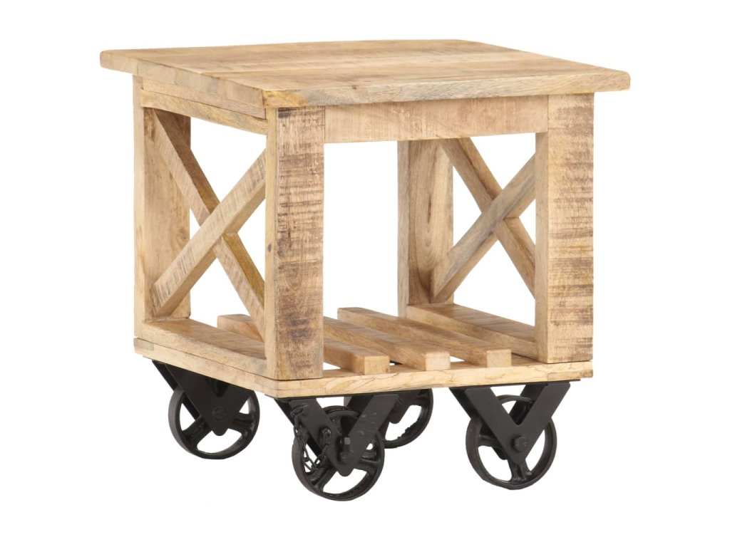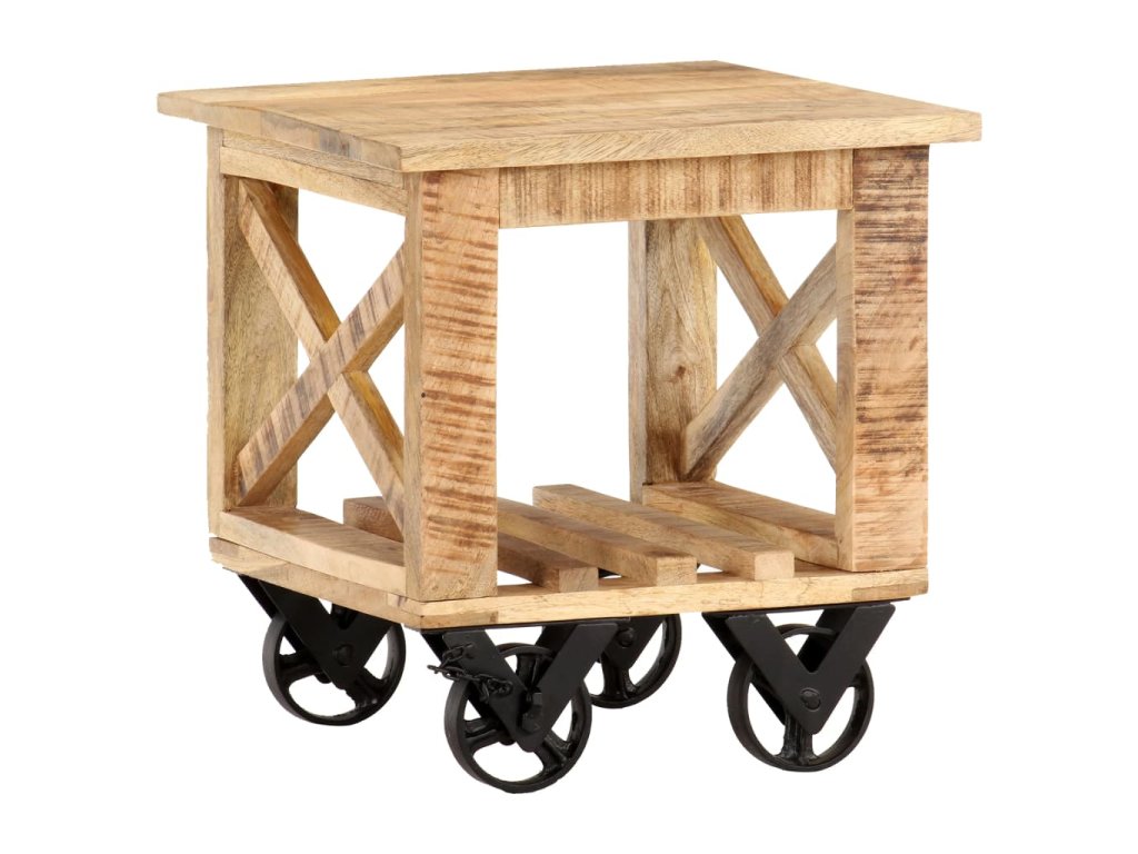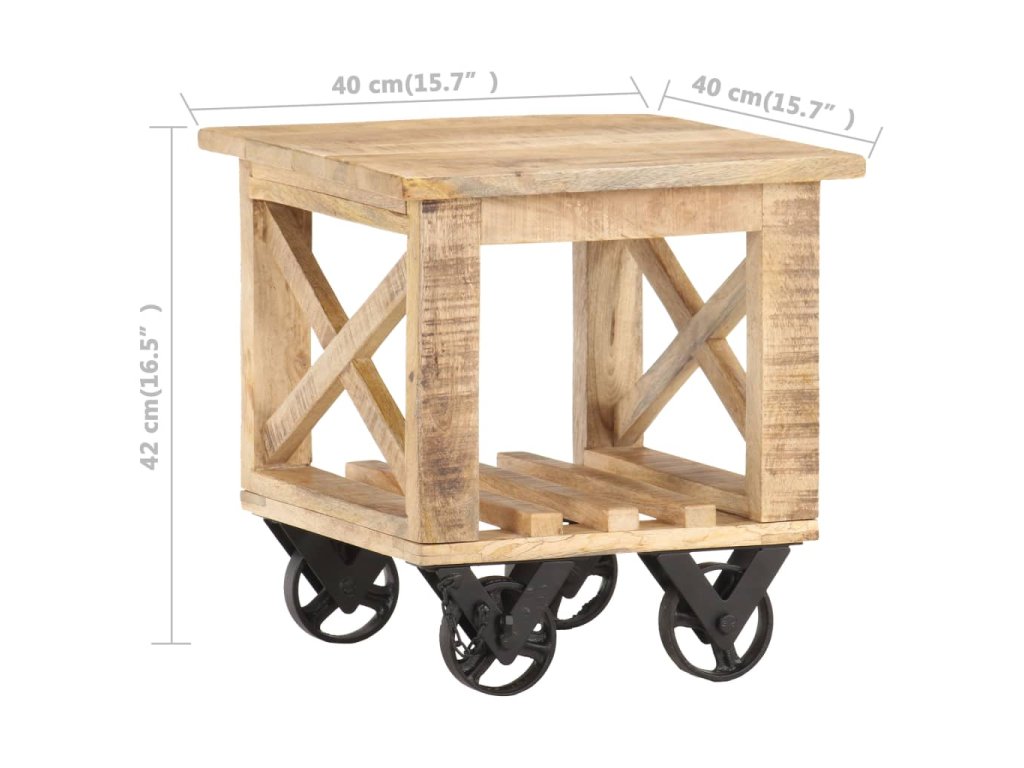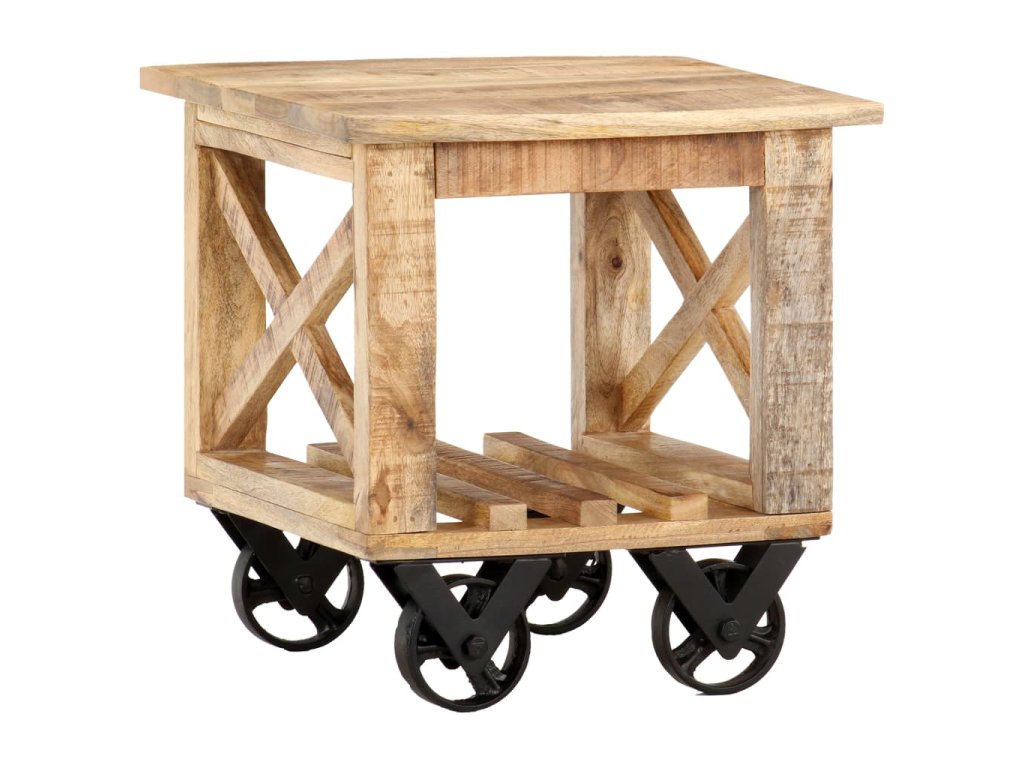 Stôl je vyrobený zo surového mangového masívu, ktorý je pevný, trvácny a krásny, a profesionálne opracovanie len umocňuje jeho pôsobivý retro vzhľad. Každý krok procesu výroby sa vykonáva s maximálnou starostlivosťou, či už ide o leštenie alebo lakovanie. Vďaka remeselnému opracovaniu a krásnej textúre dreva je každý kus nábytku jedinečný a trochu odlišný od ostatných. Stolík je vybavený 4 hladko sa otáčajúcimi kolieskami pre jednoduché premiestňovanie. Spodná polička vám poskytne praktické miesto na odkladanie kníh a časopisov.