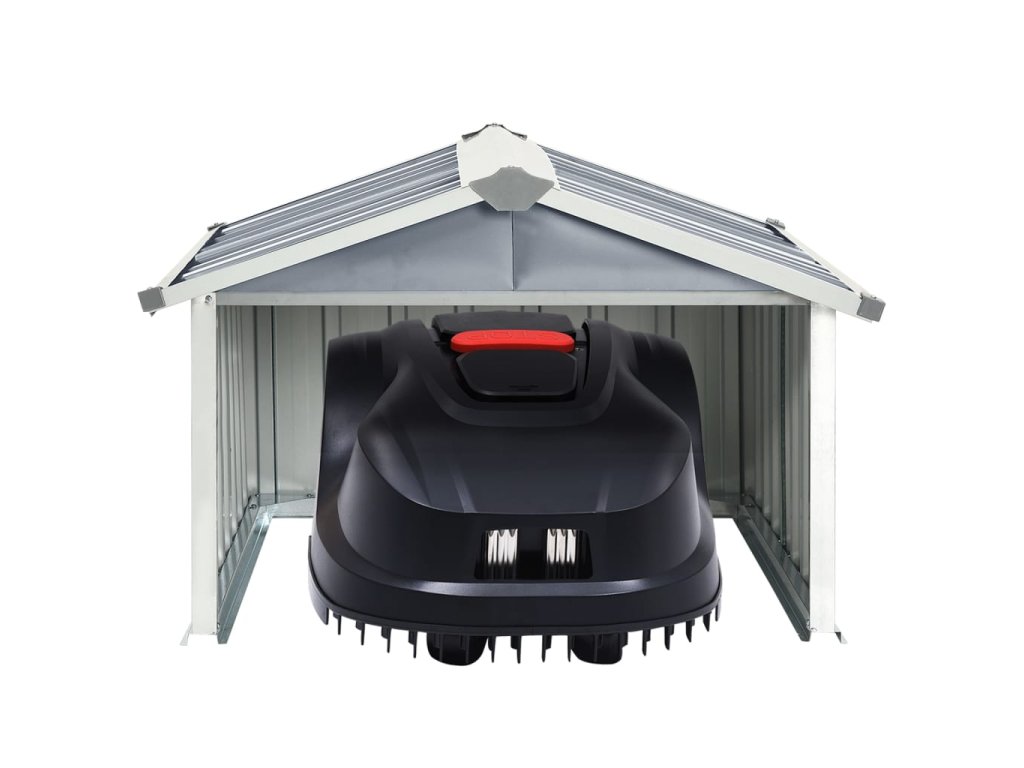 Vďaka pozinkovanej oceľovej konštrukcii je skladovacia záhradka pevná a stabilná. Nabíjaciu stanicu môžete umiestniť do garáže a robotická kosačka do nej vstúpi vždy, keď ju bude potrebné nabiť. Robotická kosačka automaticky vojde dovnútra a dobre tam zostane, kým znova pôjde von kosiť trávu.