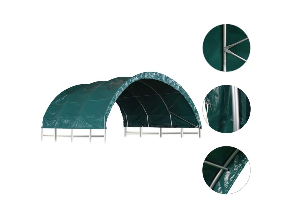 Prístrešok pre hospodárske zvieratá je vyrobený zo 100% PVC materiálu, ktorý je odolný voči UV žiareniu a vode. Rám bol vyrobený z nehrdzavejúcej ocele, vďaka čomu je veľmi odolný. Tento stan pre zvieratá sa dá ľahko zostaviť. Balenie obsahuje strechu, oceľový rám a všetky ostatné doplnky, ktoré potrebujete na jeho inštaláciu.