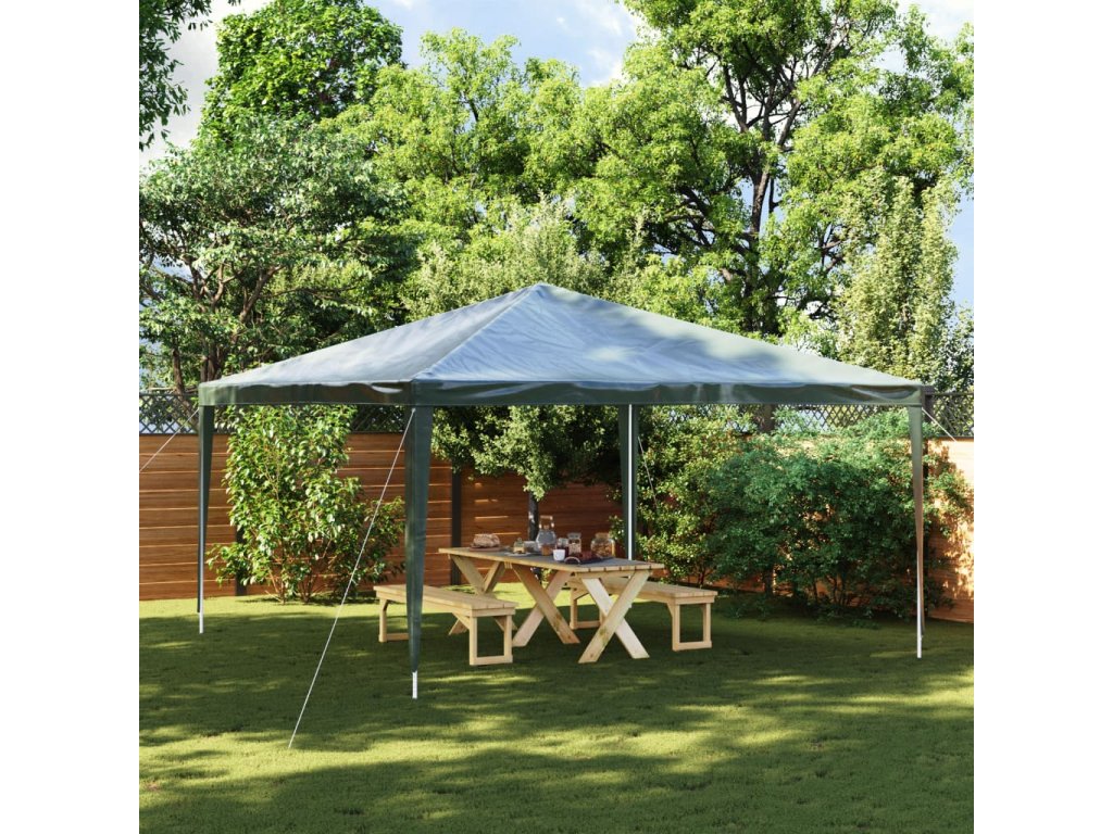 Párty stan je vyrobený z polyetylénového materiálu, ktorý je vodovzdorný a odolný voči UV žiareniu, a preto je naozaj vhodný do exteriéru. Rám je vyhotovený z ocele odolnej voči hrdzi, vďaka čomu je vonkajší prístrešok veľmi stabilný a trvácny. Záhradný altánok sa jednoducho montuje.