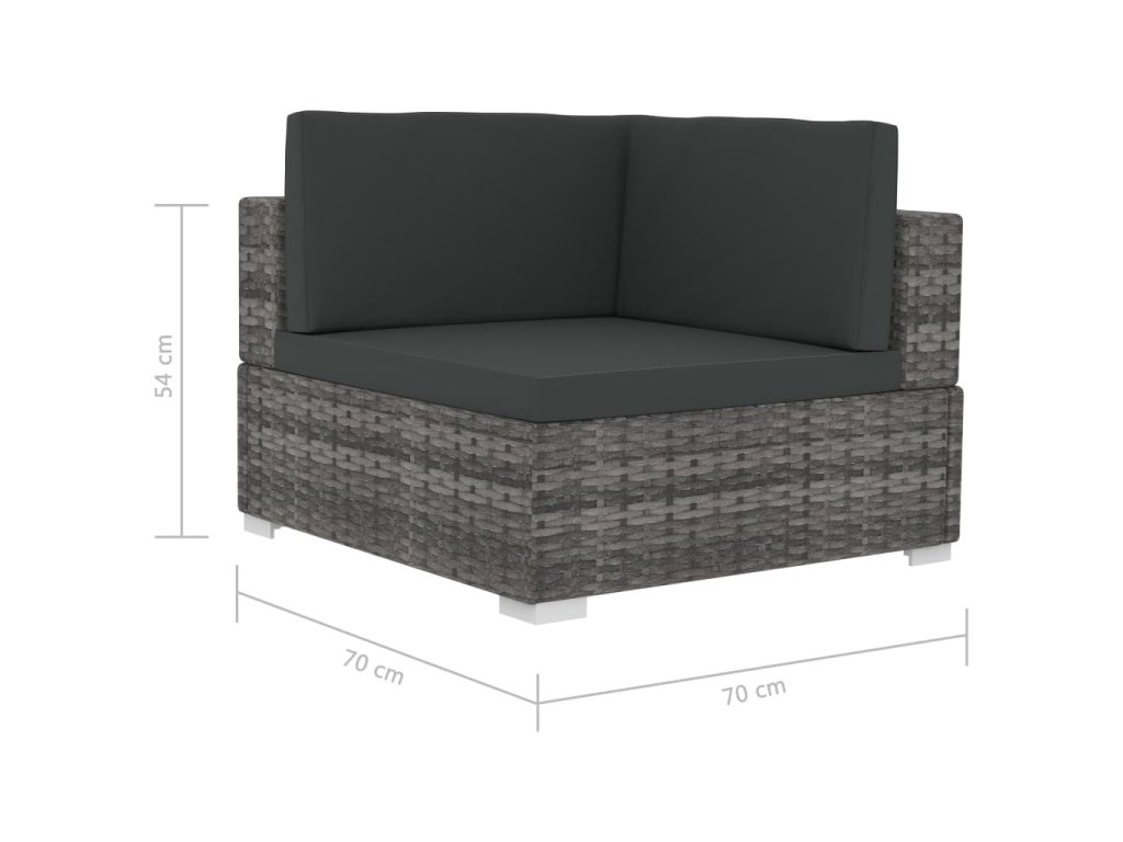 Rohová pohovka je vyrobená z vodovzdorného PE ratanu, ktorý je odolný voči poveternostným vplyvom, takže sa ľahko čistí, je odolná a vhodná na každodenné používanie. Sedadlo má pevný oceľový rám s práškovou povrchovou úpravou, ktorý je veľmi trvácny. Sedačka je okrem toho ľahká a modulárna, takže sa dá ľubovoľne presúvať, aby vyhovovala akýmkoľvek priestorom. Hrubé odnímateľné podložky vám poskytnú optimálne pohodlie. Môžete ju skombinovať s ďalšími stredovými sedačkami či podnožkami, ktoré nájdete v rozbaľovacom menu, a vytvoriť si tak záhradné sedenie podľa svojich predstáv!
