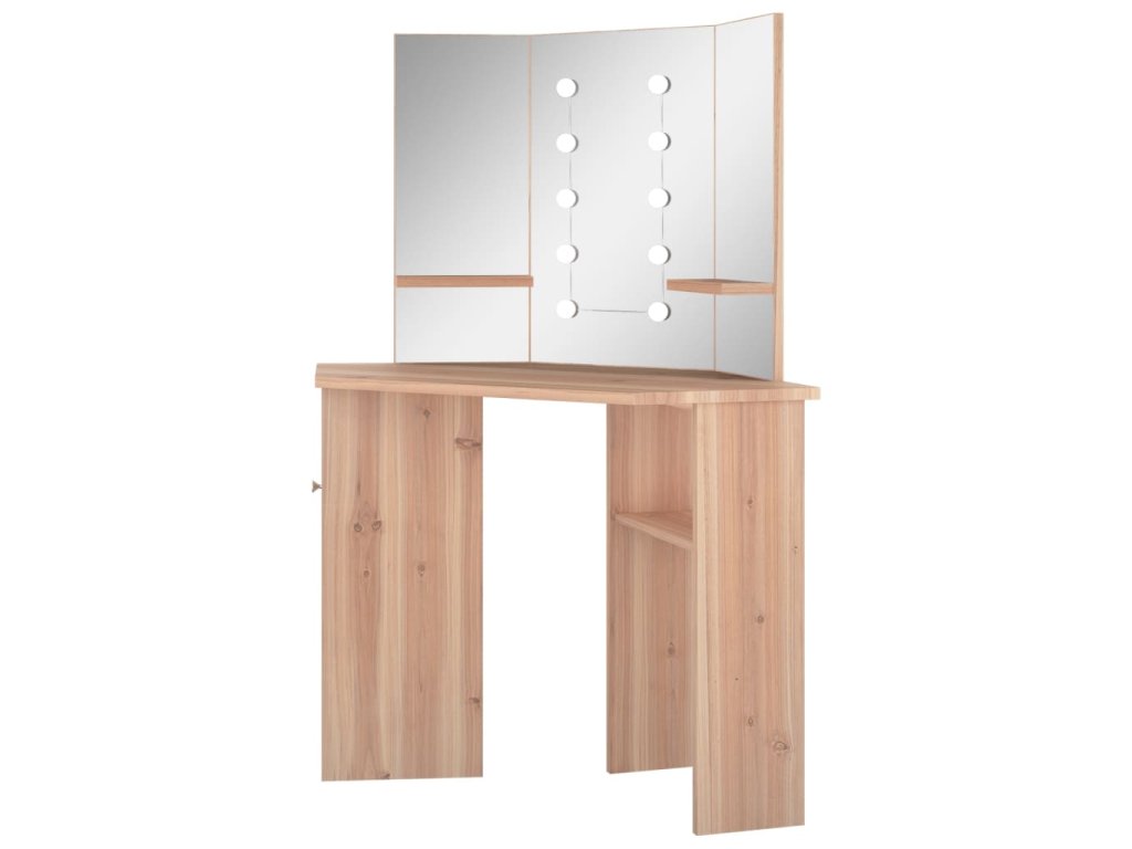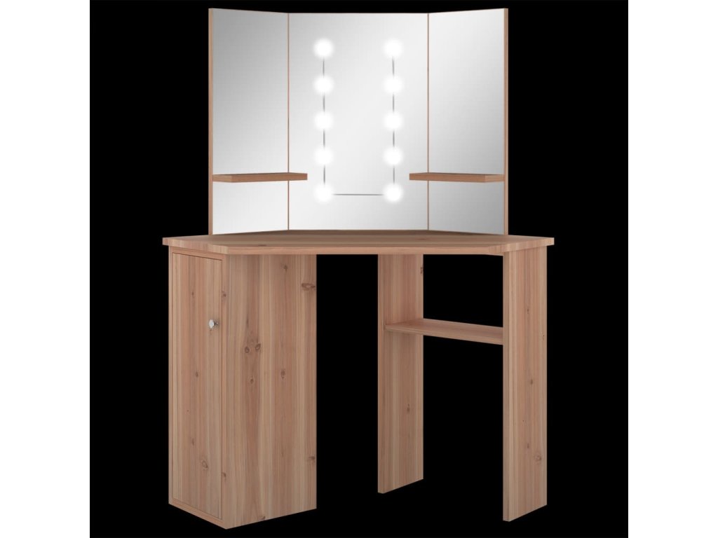 Tento toaletný stolík, vyrobený z kvalitného MDF, zaujme elegantnou siluetou a jednoduchými líniami v modernom štýle. Je navrhnutý tak, aby sa pohodlne vošiel do rohu a zároveň ponúkol na malom priestore veľa úložného priestoru. Priestranná skrinka a otvorená polica pod stolovou doskou slúži na prehľadné uloženie líčenia a kozmetiky, a keďže sa otvárajú do strán, máte k nim jednoduchý prístup aj keď sedíte pri stole. Krásne 3 panelové zrkadlo vás odráža z 3 strán pre pohodlnú aplikáciu make-upu a zároveň dodáva stolíku elegantný vzhľad. K dvom bočným panelom sú pridané spodné police na fľaštičky, štetce na líčenie, krémy, parfumy a dekoratívne predmety. Elegantné LED diódy vám poskytnú optimálne osvetlenie.