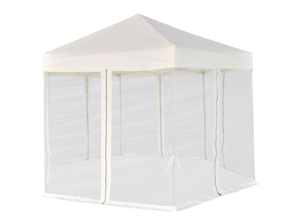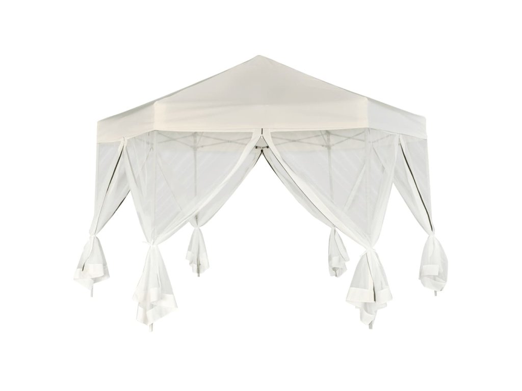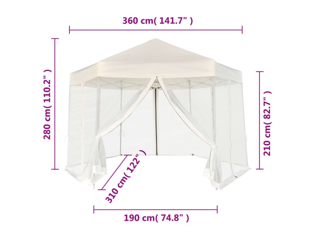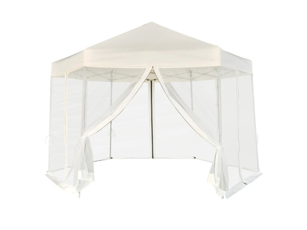 Vďaka odolnému oceľovému rámu s práškovou povrchovou úpravou a pevnej konštrukcii v tvare šesťuholníka je tento rozkladací stan skutočne stabilný a trvácny. Strecha vyrobená z polyesteru s vrstvou PA je vodovzdorná. Súčaštou balenia je aj 6 sieťkovaných bočných stien, ktoré sa dajú úplne zatvoriť pomocou obojstranných zipsov a okrem toho ich môžete pripevniť k stĺpkom pomocou laniek (v balení), čím zabezpečíte jednoduchý vstup do stanu a dobré prúdenie vzduchu.