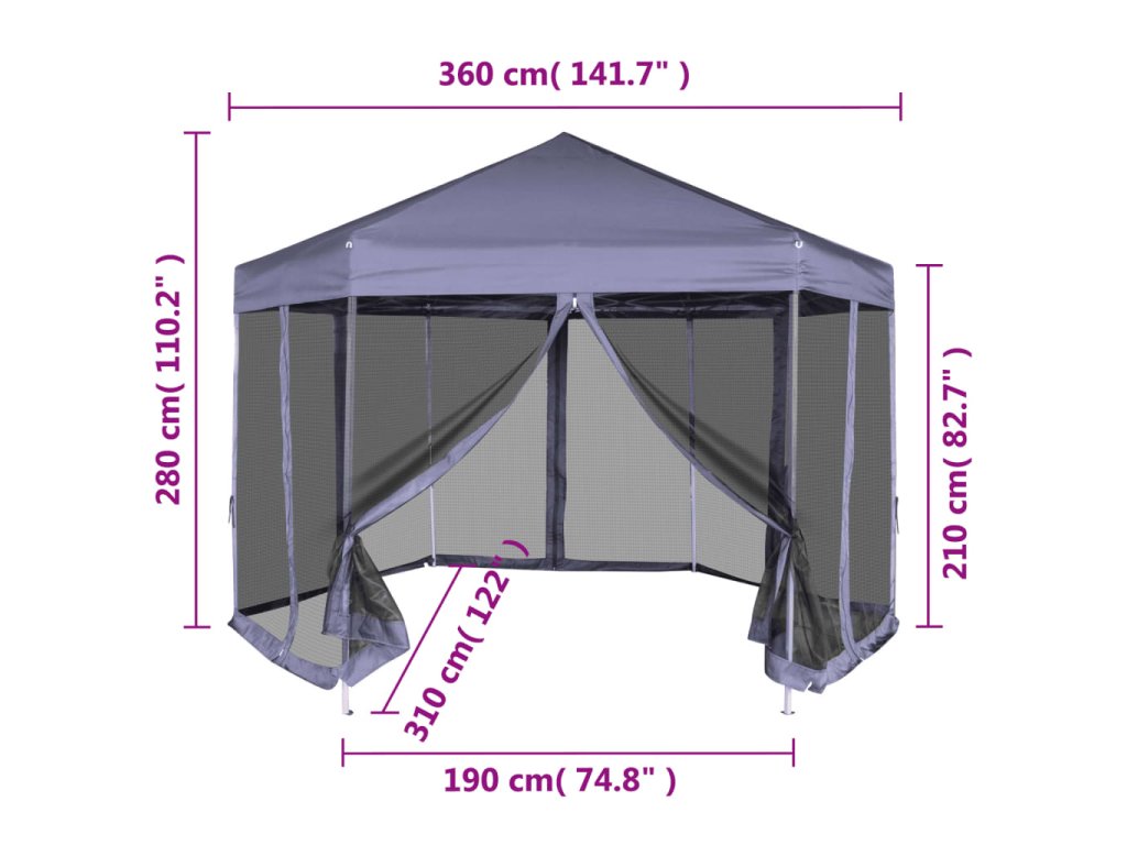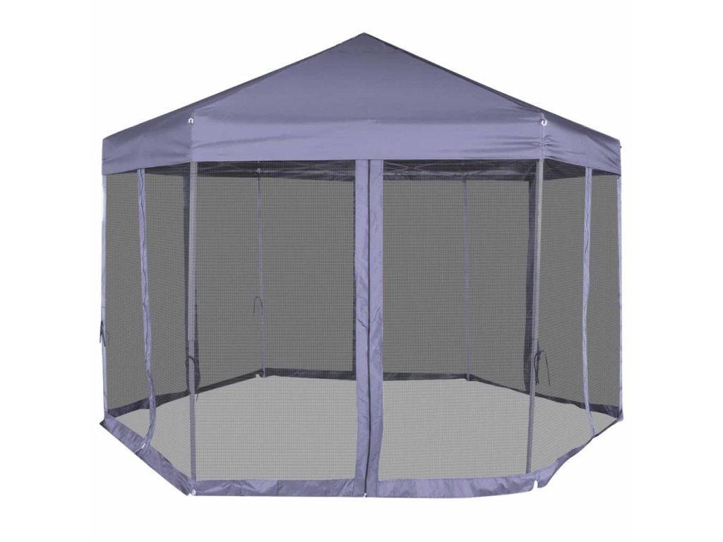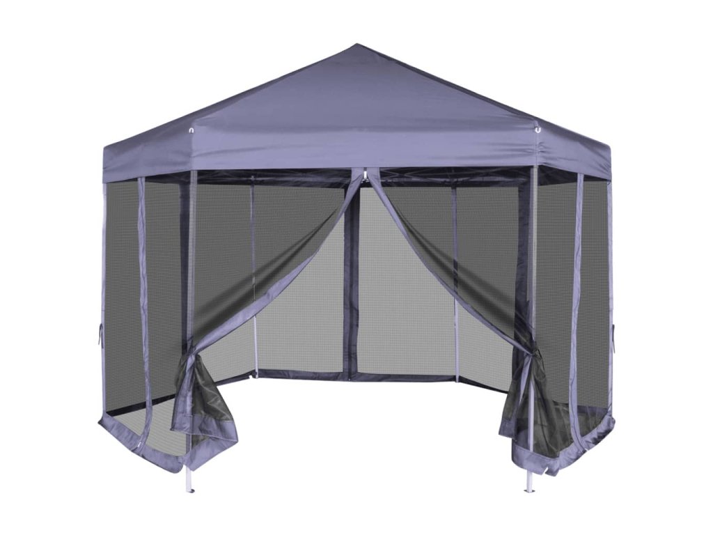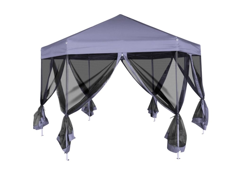 Vďaka odolnému oceľovému rámu s práškovou povrchovou úpravou a pevnej konštrukcii v tvare šesťuholníka je tento rozkladací stan skutočne stabilný a trvácny. Strecha vyrobená z polyesteru s vrstvou PA je vodovzdorná. Súčaštou balenia je aj 6 sieťkovaných bočných stien, ktoré sa dajú úplne zatvoriť pomocou obojstranných zipsov a okrem toho ich môžete pripevniť k stĺpkom pomocou laniek (v balení), čím zabezpečíte jednoduchý vstup do stanu a dobré prúdenie vzduchu.