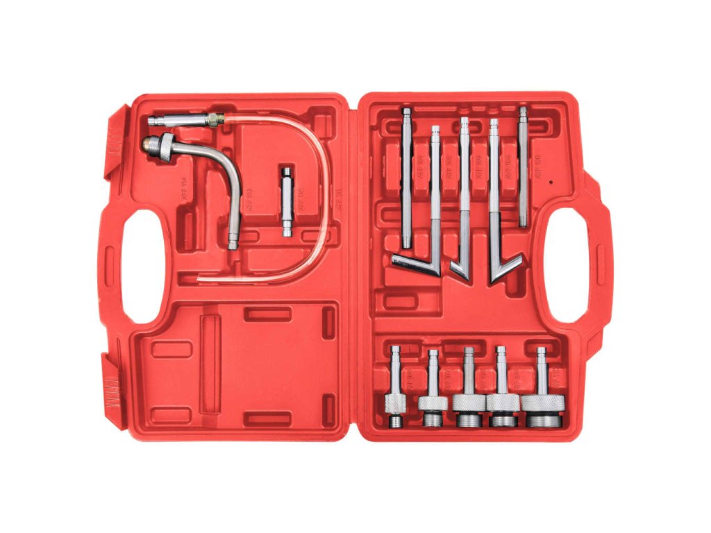 Táto pneumatická plnička sa vyznačuje profesionálnym spracovaním, stabilným výkonom, odolnosťou a dobrou spoľahlivosťou. Je vybavená funkciou spätného chodu pre prevodovky s prepúšťacím plniacim otvorom. Táto sada obsahuje 13 ATF adaptérov s rôznymi výstupnými uhlami a rôznymi závitmi, ktoré sú kompatibilné so značkami Ford, Benz, VW, Audi, Porsche, Škoda a ďalšími. Všetky adaptéry sú navyše úhľadne usporiadané v pevnom plastovom kufríku, ktorý zaručuje dlhú životnosť aj pri každodennom používaní v dielni.