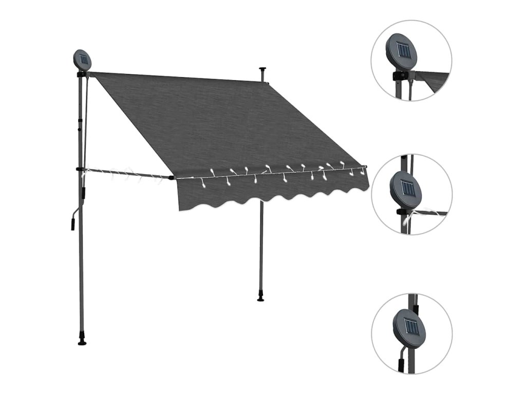 Táto markíza je vyrobená z kvalitného polyesteru s vrstvou PU, vďaka čomu odpudzuje vodu a nečistoty a je odolná voči UV žiareniu a poveternostným vplyvom. Markíza má pevný oceľový rám, takže je robustná a trvácna. Polyesterová strieška sa dá jednoducho odstrániť z rámu a očistiť. Markíza sa dá zatiahnuť pomocou ručnej kľuky. Výška aj sklon markízy sa dajú nastaviť podľa potreby. Solárne LED svetlá v noci vytvoria príjemné osvetlenie. Markíza sa jednoducho montuje.