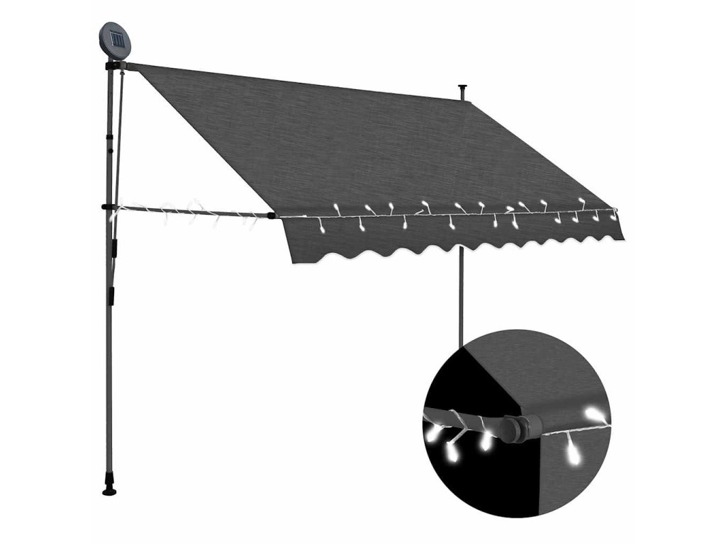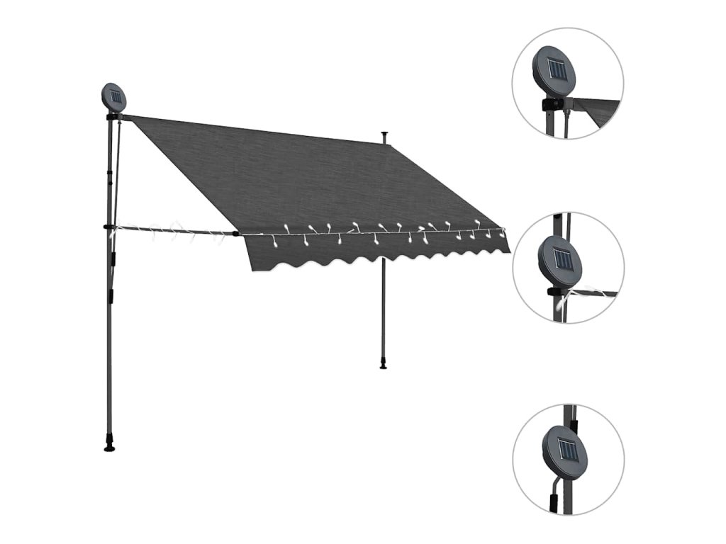 Táto markíza je vyrobená z kvalitného polyesteru s vrstvou PU, vďaka čomu odpudzuje vodu a nečistoty a je odolná voči UV žiareniu a poveternostným vplyvom. Markíza má pevný oceľový rám, takže je robustná a trvácna. Polyesterová strieška sa dá jednoducho odstrániť z rámu a očistiť. Markíza sa dá zatiahnuť pomocou ručnej kľuky. Výška aj sklon markízy sa dajú nastaviť podľa potreby. Solárne LED svetlá v noci vytvoria príjemné osvetlenie. Markíza sa jednoducho montuje.