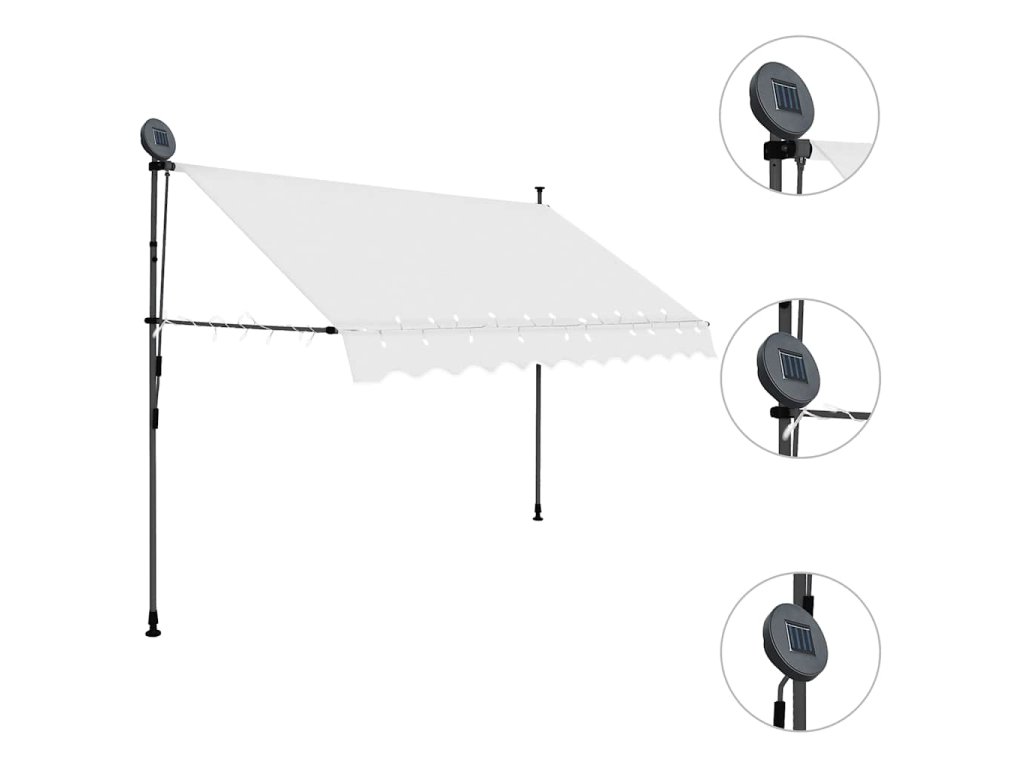 Táto markíza je vyrobená z kvalitného polyesteru s vrstvou PU, vďaka čomu odpudzuje vodu a nečistoty a je odolná voči UV žiareniu a poveternostným vplyvom. Markíza má pevný oceľový rám, takže je robustná a trvácna. Polyesterová strieška sa dá jednoducho odstrániť z rámu a očistiť. Markíza sa dá zatiahnuť pomocou ručnej kľuky. Výška aj sklon markízy sa dajú nastaviť podľa potreby. Solárne LED svetlá v noci vytvoria príjemné osvetlenie. Markíza sa jednoducho montuje.