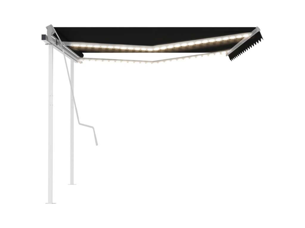 Táto vonkajšia markíza má rám vyrobený z nehrdzavejúceho hliníka s práškovou povrchovou úpravou. Má ľahký dizajn, ale napriek tomu pevnú štruktúru. Vďaka pevnému železnému stĺpiku je stabilná. Ručne zaťahovacia markíza má tkaninu vyrobenú z polyesteru s vysokou hustotou a PU povrch, ktorý je vodeodolný a odolný voči UV žiareniu. Uhol a výška sa dá upraviť podľa vašich konkrétnych potrieb. Pomocou dlhej kľučky ju môžete jednoducho otvoriť a zatiahnuť. Solárne LED svetlá navyše poskytujú v noci energeticky úsporné osvetlenie.