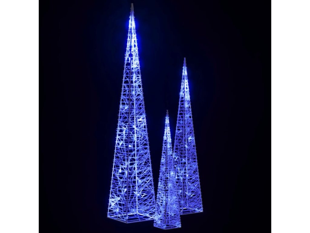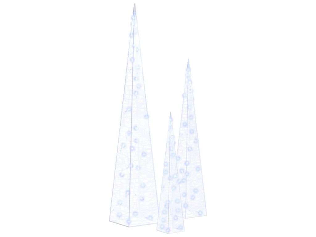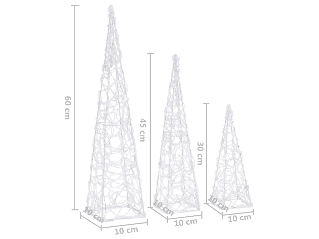 Sada obsahuje 3 svetelné kužele s rôznou výškou. Telo dekoratívneho svetelného kužeľa je vyrobené z akrylu, ktorý mu dodáva luxusný, ľadový, lesklý vzhľad, ktorý rozžiari okolie. Je vybavený energeticky úspornými LED diódami a poskytuje jasné a výkonné osvetlenie. Má 8 rôznych svetelných efektov: kombinovaný režim, vlny, sekvenčný režim, režim pomalého žiarenia, blikanie, režim pomalého slabnutia, trblietanie a nepretržité osvetlenie. Tento krásny vianočný svetelný kužeľ a pribalený kryt na batérie sú vodotesné, takže je produkt vhodný pre vnútorné i vonkajšie použitie.