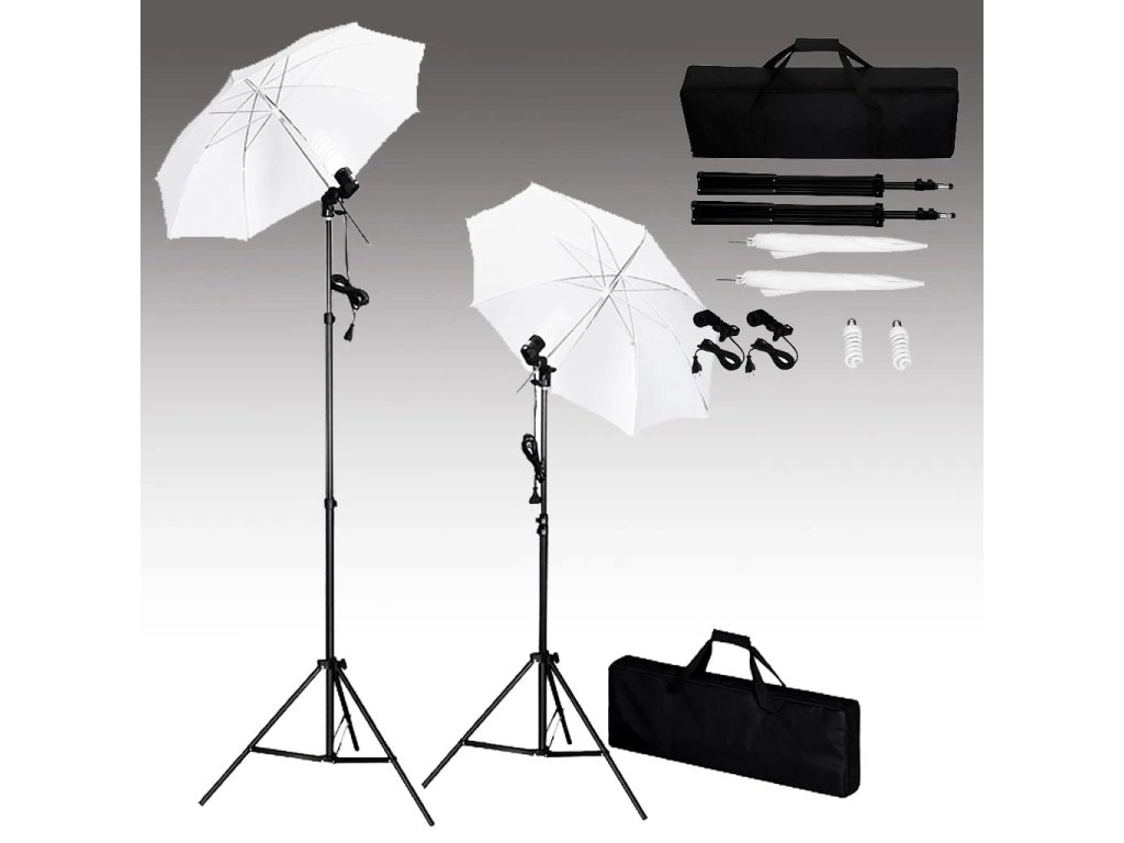 Sada osvetlenia je ideálna pre digitálne a analógové fotografie výrobkov a pre portréty. Keď použijete lampy s denným svetlom s farebnou teplotou 5500 kelvinov, podarí sa vám fotený predmet alebo osobu zachytiť tak, že konečný výsledok bude pôsobiť prirodzene. Svetelný výkon dvoch lámp je 100 wattov a zabezpečujú ho len 24-wattové energeticky úsporné žiarovky. Súprava štúdiového osvetlenia je vhodná na fotenie analógových aj digitálnych fotografií. Lampa sa dá pripevniť na statív, a tak ju môžete umiestniť do výšky až 230 cm. Dva biele dáždniky poskytujú jemné osvetlenie, ktoré zabráni tomu, aby sa na fotkách vytvárali nepekné tiene. Celé vybavenie sa dá rýchlo a ľahko poskladať a zmestí sa do praktickej tašky, v ktorej si ho so sebou môžete zobrať kamkoľvek.
