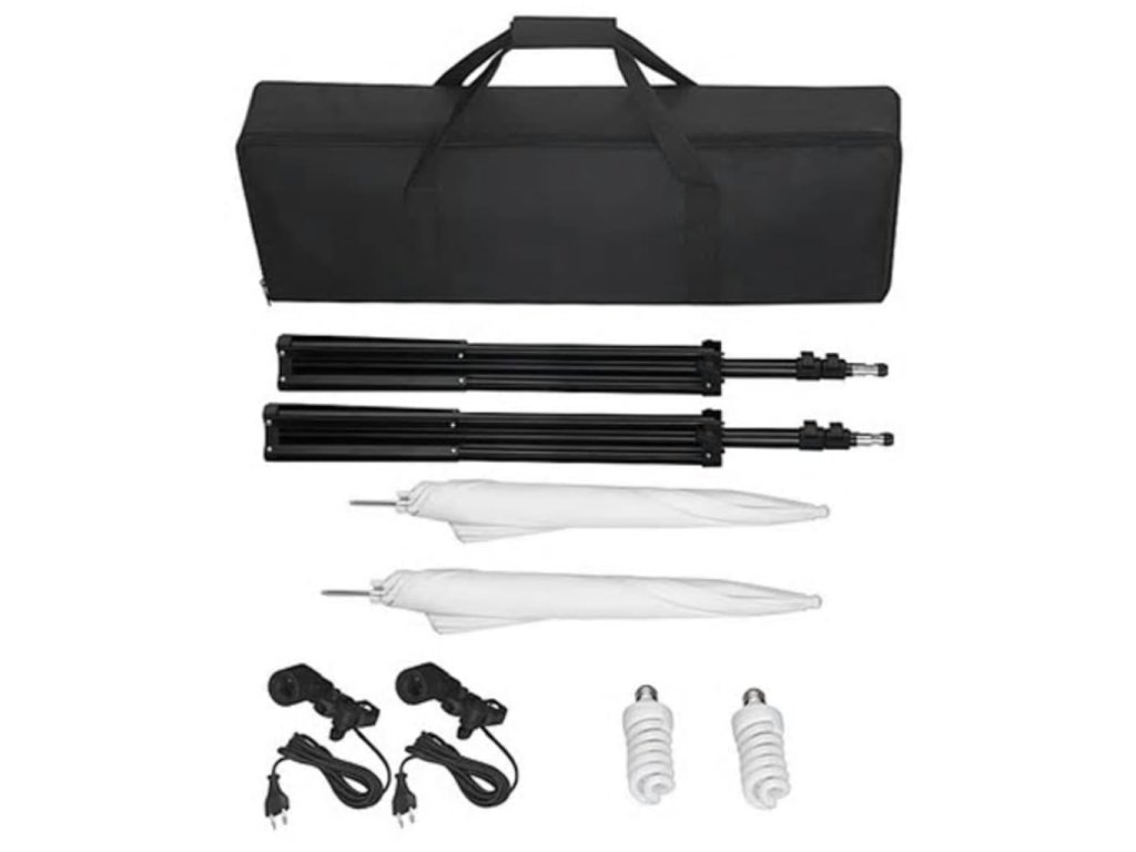 Sada osvetlenia je ideálna pre digitálne a analógové fotografie výrobkov a pre portréty. Keď použijete lampy s denným svetlom s farebnou teplotou 5500 kelvinov, podarí sa vám fotený predmet alebo osobu zachytiť tak, že konečný výsledok bude pôsobiť prirodzene. Svetelný výkon dvoch lámp je 100 wattov a zabezpečujú ho len 24-wattové energeticky úsporné žiarovky. Súprava štúdiového osvetlenia je vhodná na fotenie analógových aj digitálnych fotografií. Lampa sa dá pripevniť na statív, a tak ju môžete umiestniť do výšky až 230 cm. Dva biele dáždniky poskytujú jemné osvetlenie, ktoré zabráni tomu, aby sa na fotkách vytvárali nepekné tiene. Celé vybavenie sa dá rýchlo a ľahko poskladať a zmestí sa do praktickej tašky, v ktorej si ho so sebou môžete zobrať kamkoľvek.