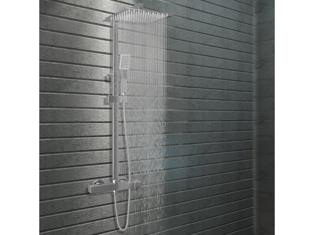 Táto sada dvojitých sprchových hlavíc s termostatom je ideálnym riešením pre luxusný zážitok zo sprchovania s dažďovou sprchou a ručnou sprchou. Elegantný dizajn, čisté línie a trblietavý vzhľad dokonale zapadajú do vašej kúpeľne.