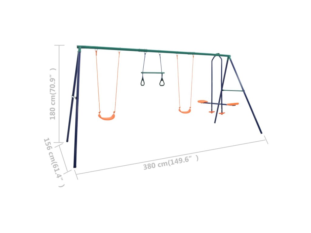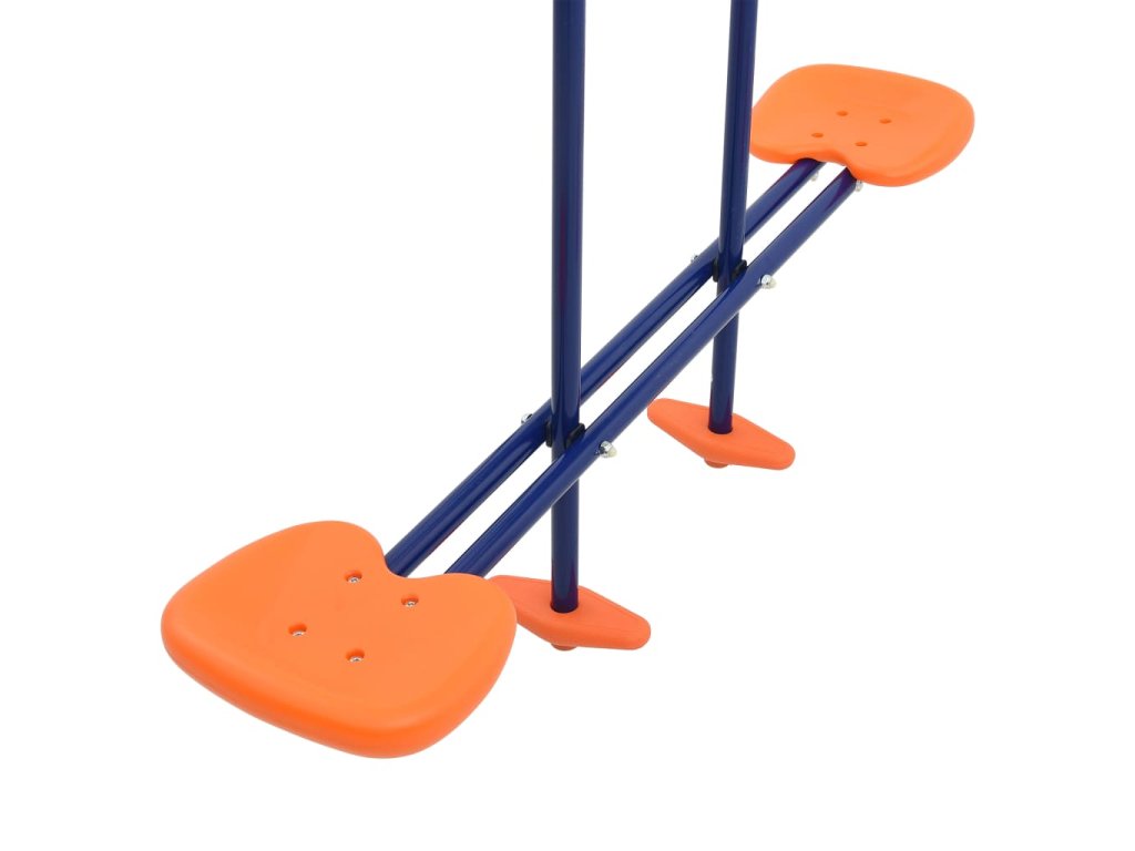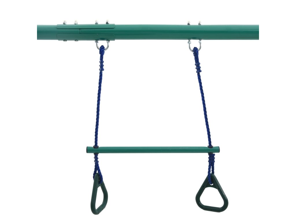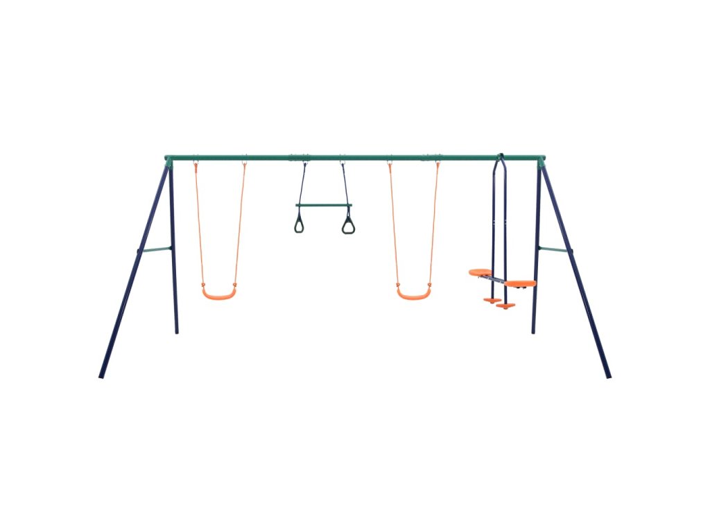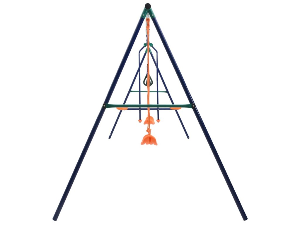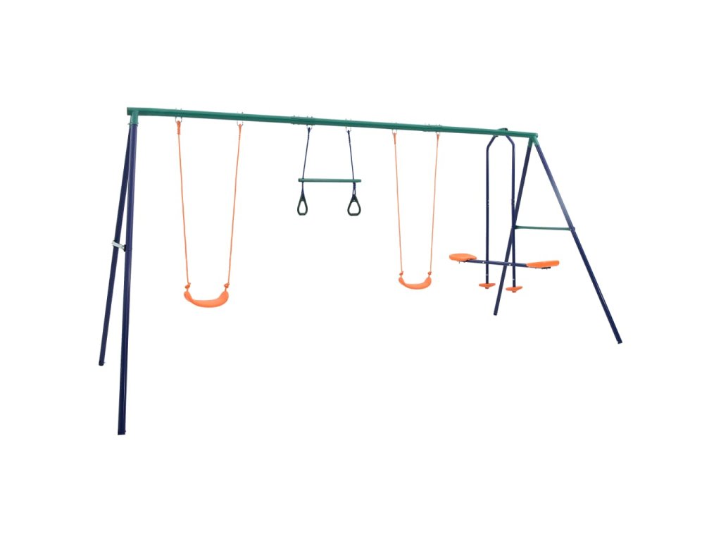 Sada hojdačiek sa skladá z pevného oceľového rámu v tvare písmena A s 2 jednomiestnymi hojdačkami, 2 gymnastickými kruhmi a jednou dvojitou hojdačkou. Dvojitá hojdačka so sedadlami je vhodná pre dve deti súčasne. Vďaka pevnému oceľovému rámu a plastovým sedadlám je sada veľmi trvácna a odolná voči poveternostným vplyvom. Jednoducho sa inštaluje. Všetky prvky sú pevne pripevnené k priečnemu nosníku rámu v tvare písme A pomocou pevných konzol, skrutiek, hákov a lán.